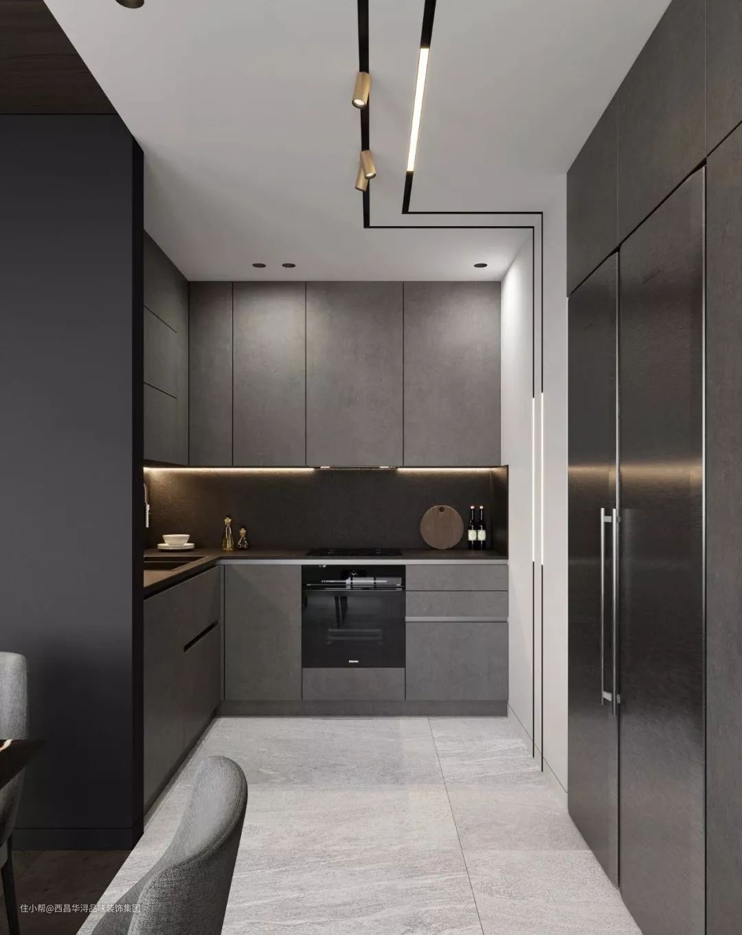 灰色系的厨房空间结构简洁,整洁而富有层次感,材质的纯粹也使得空间更为的简洁和现代。黑色的餐桌,鱼骨拼的木地板,光泽的条形吊灯悬于餐桌之上,营造出典雅轻松的用餐氛围。