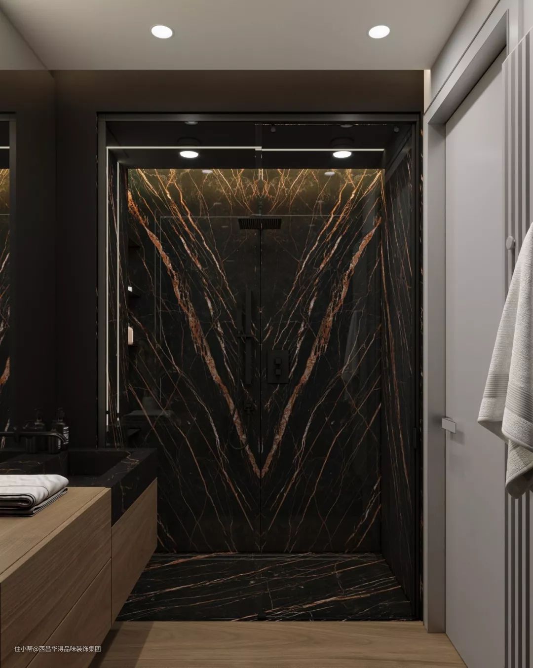 卫生间的设计设计师通过黑色大理石和木质,既扩大了视觉空间又与整个风格十分搭调。
