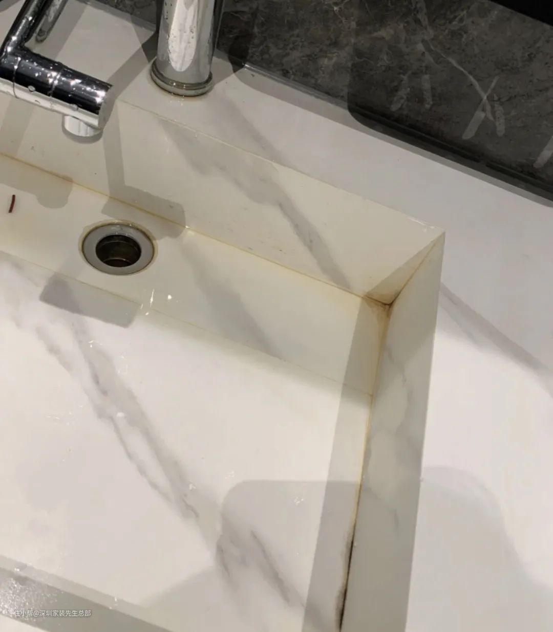 话又说回来,如果能在装修时避免这件事,那还是很省家务时间的。那么有些人说,我选择浅色的不就行了吗?肯定不行,因为岩板只能做成直角,长时间下来,水池周围也成了卫生重灾区,发黄、发霉严重。