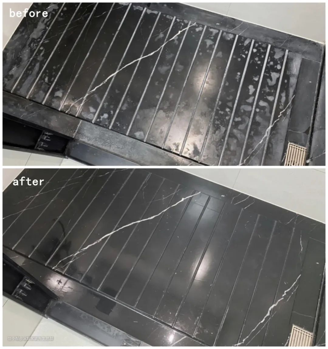 小贴士: 如果家里出现此问题,应定期用渗色清洁剂清洗,上图为清洗对比图,效果仍十分明显,且,家中瓷砖、陶瓷、石英石等材质的家居,均可使用。