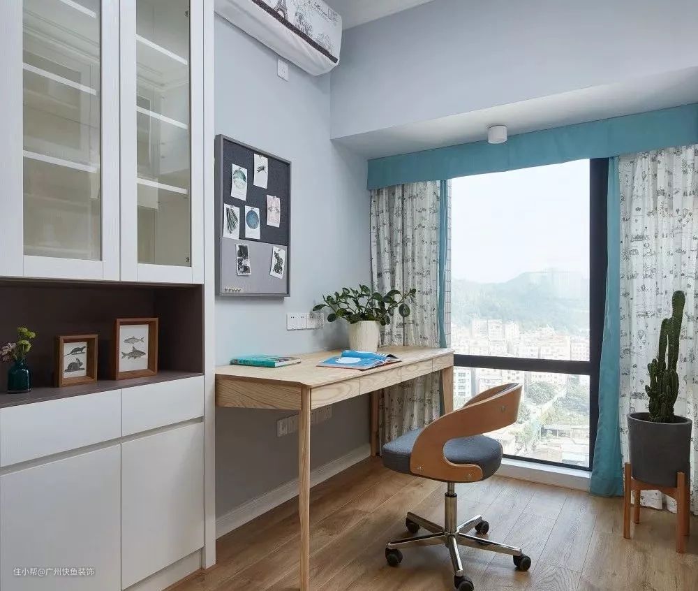 客厅的右手边就是书房,用玻璃推拉门做了隔断。里面有个大大的落地窗,视野还蛮开阔的。喜欢这样的布局和搭配,让人觉得很舒服。