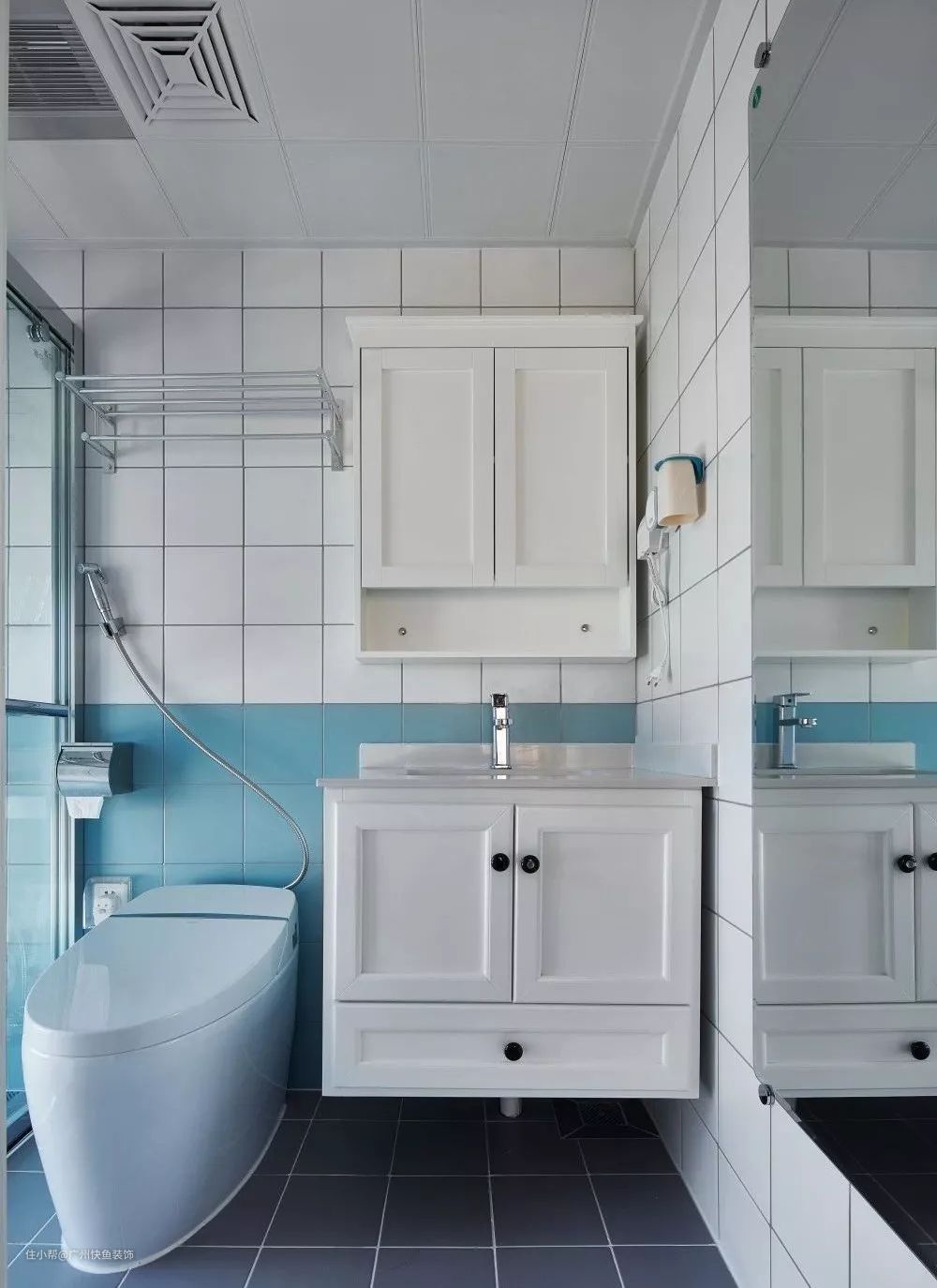 主卫是灰白蓝的搭配,清新中带点大气风,收纳和干湿分离都做得不错,安利。