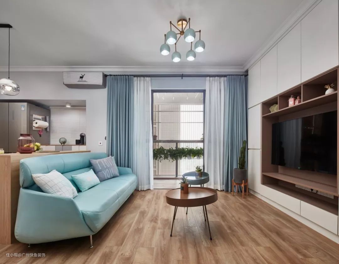 浅蓝色的小沙发格外吸睛,让人觉得很温馨。电视背景墙是嵌入式收纳柜设计,把电视机融入其中,大方又实用。