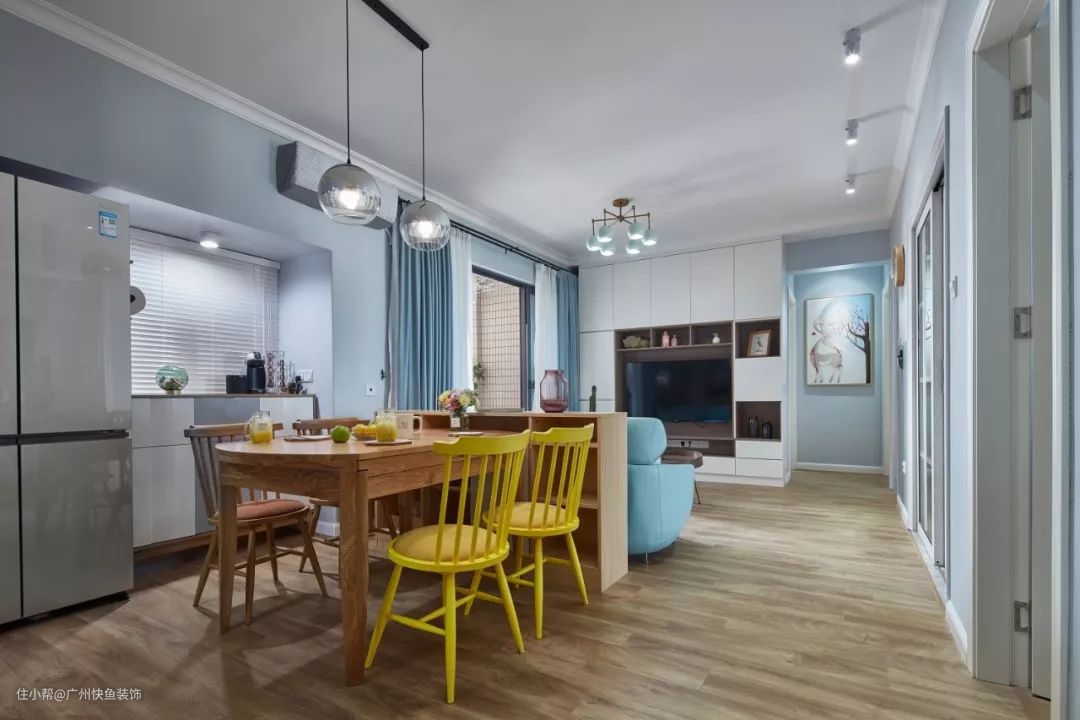 清新北欧装修,从客餐厅开始,收纳就做得超棒。最精致的地方就在于嵌入式的柜子的设计!加上整体蓝白色的清爽搭配,真心不错!