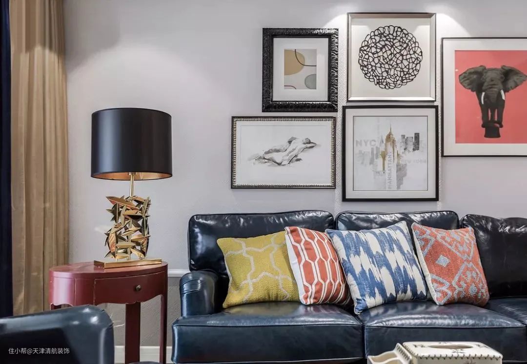 ▲ 黑色皮质沙发、黑色台灯搭配枣红色边桌、四色花纹抱枕,色彩浓烈深沉,材质软硬结合,粗犷而不失柔和,让人感觉温暖又舒适。