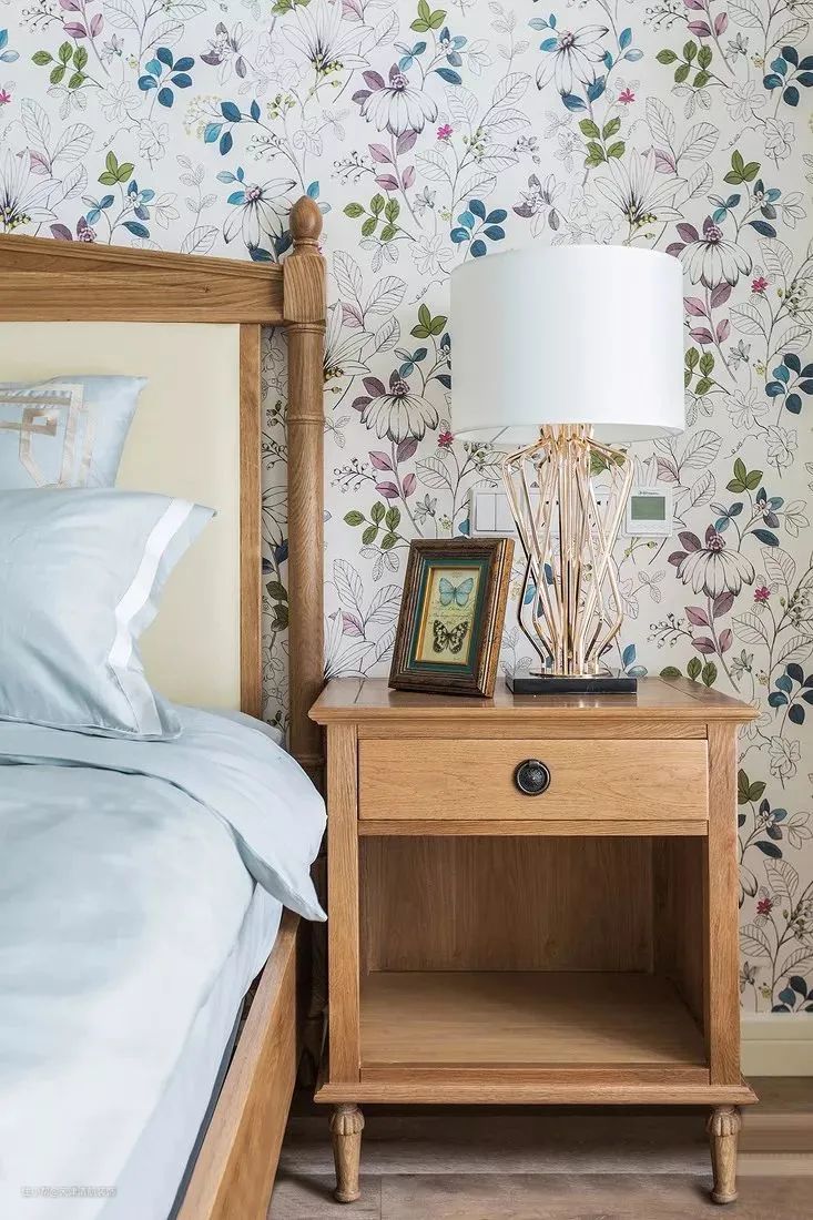 ▲卧室采用 原木色温润实木家具、清新碎花墙纸,浅色系床品,打造温馨柔和的休憩之所。