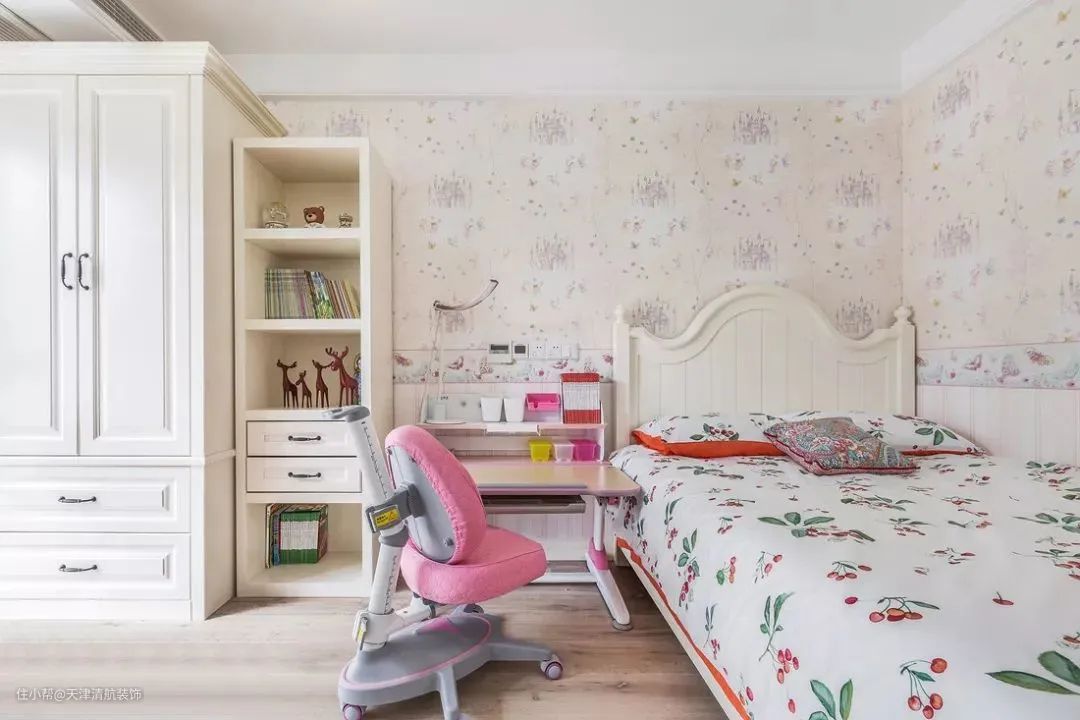 ▲ 同样是清新碎花墙纸和床品,但多了粉红色的点缀,儿童房瞬间就变得童心满满了。