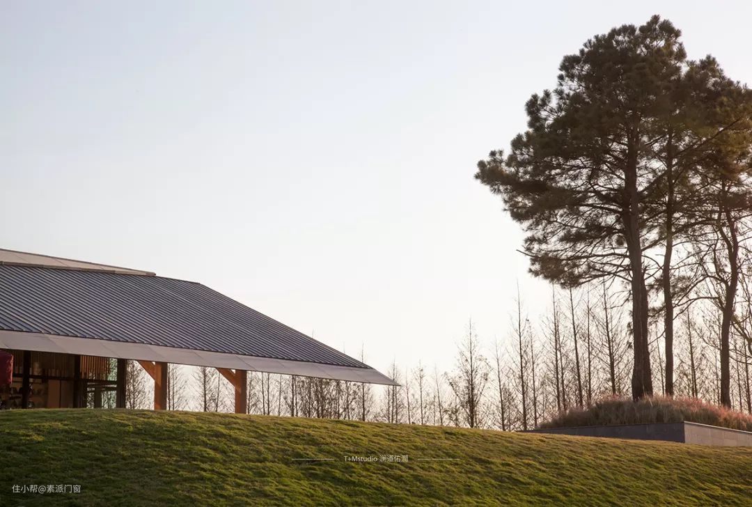 庞大的建筑被隐藏在坡地之下,灰色的坡屋顶与绿色草坡错落交织,形成层级进退关系,被刻意压低的屋檐似松树的守护者,谦逊的守在树下。