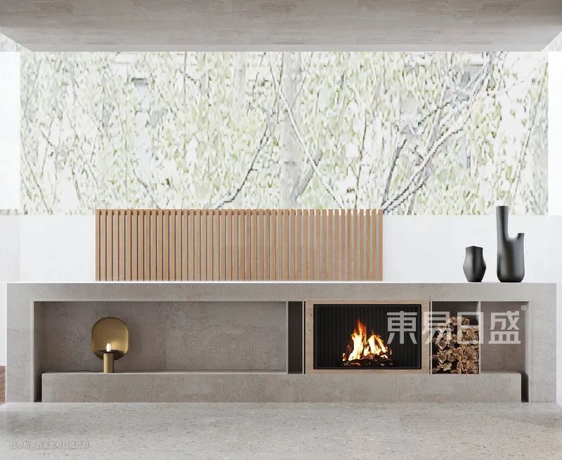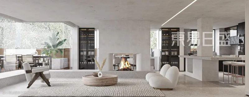 本案整体以灰白为底色,纯粹而自然,最大限度上减少了其他色彩或点缀物品,代表着侘寂风格中对自然和朴质的追求。
