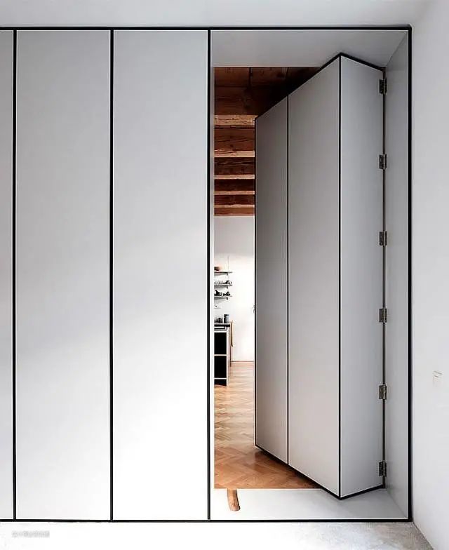 门可以设计的和柜子融为一体,这样基本上达到了很好的隐藏效果。一般在衣帽柜和储物柜这样的地方,最适合做隐形门了~