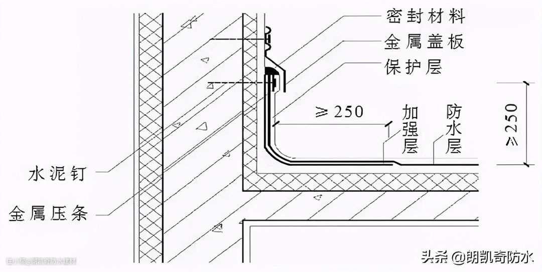 4、高女儿墙泛水处的防水层泛水高度不小于250 mm,泛水上部的墙体应作防水处理。高女儿墙泛水处的防水层收头采用金属盖板的防水构造,固定、密封效果不好,防水层收头应留置在凹槽内固定、密封,凹槽用聚合物砂浆抹密实。