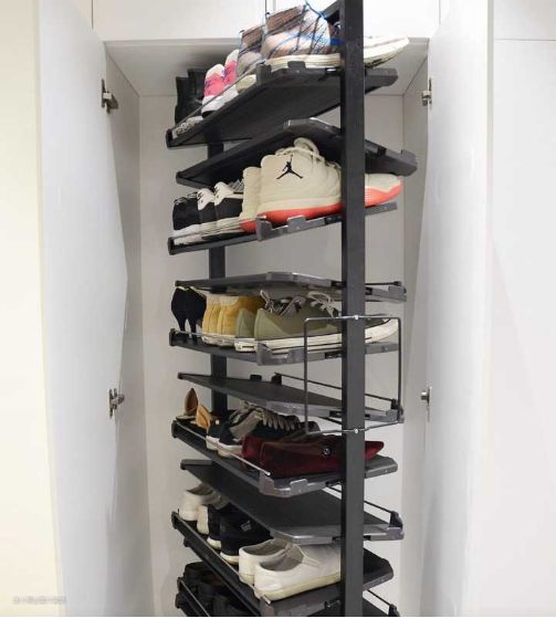 它可以360°旋转,两面都能放鞋,鞋架高度可以根据需求调整,收纳六七十双鞋不成问题,如果家里柜子比较深,尺寸不合适,还可以给侧边和后面增加隔板,收纳高筒靴。