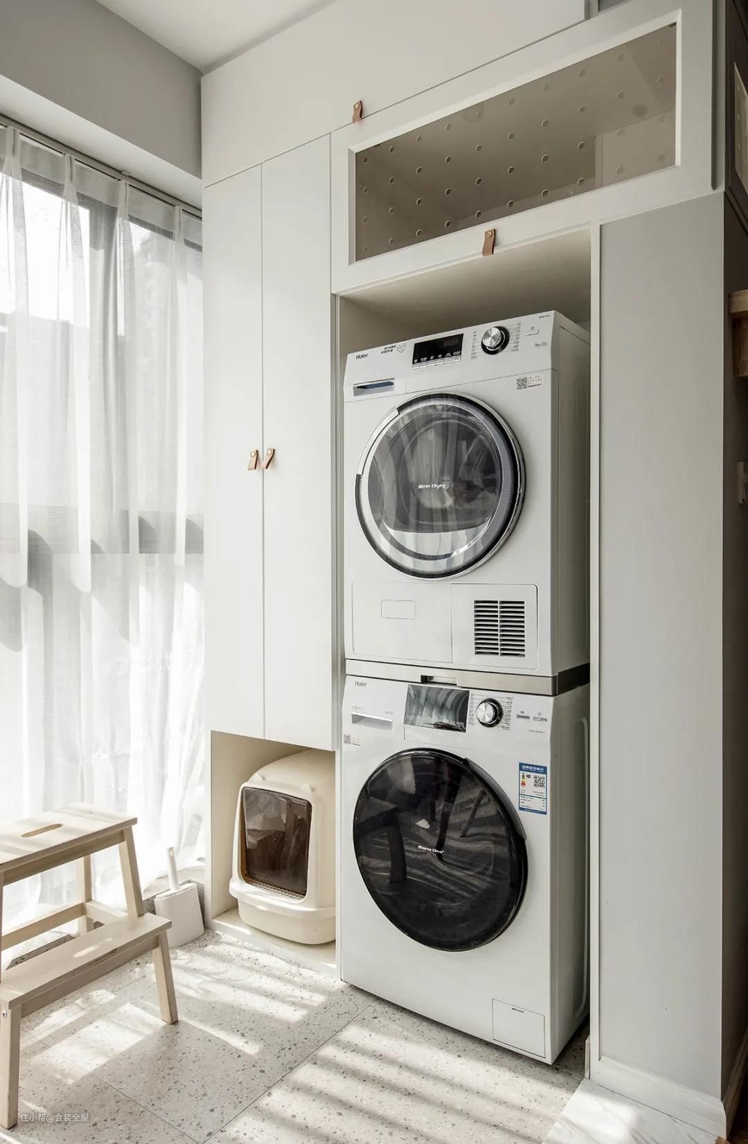 在阳台上定制一个阳台柜,可以把洗衣机嵌入进去里面,显得更加整齐,只要提前确定好洗衣机的尺寸,就可以量尺定制了。