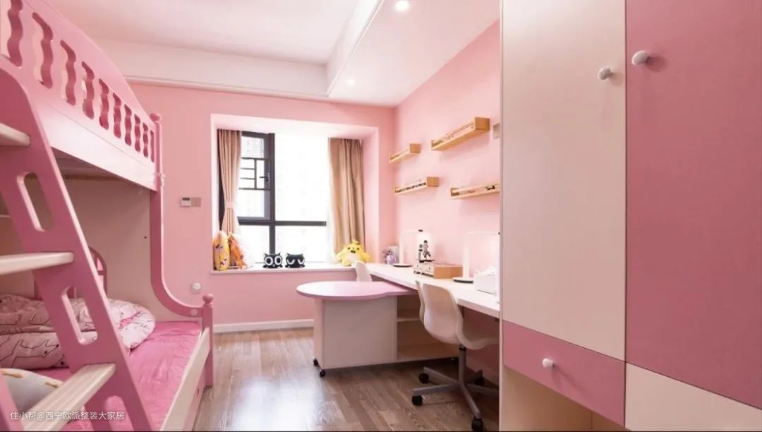 必要的话,可以设置隔帘或隔板遮挡,将房间空间一分为二,让双方拥有一定的私密空间,这样设计短期提高空间利用率,长期来说更适合两个孩子的成长。