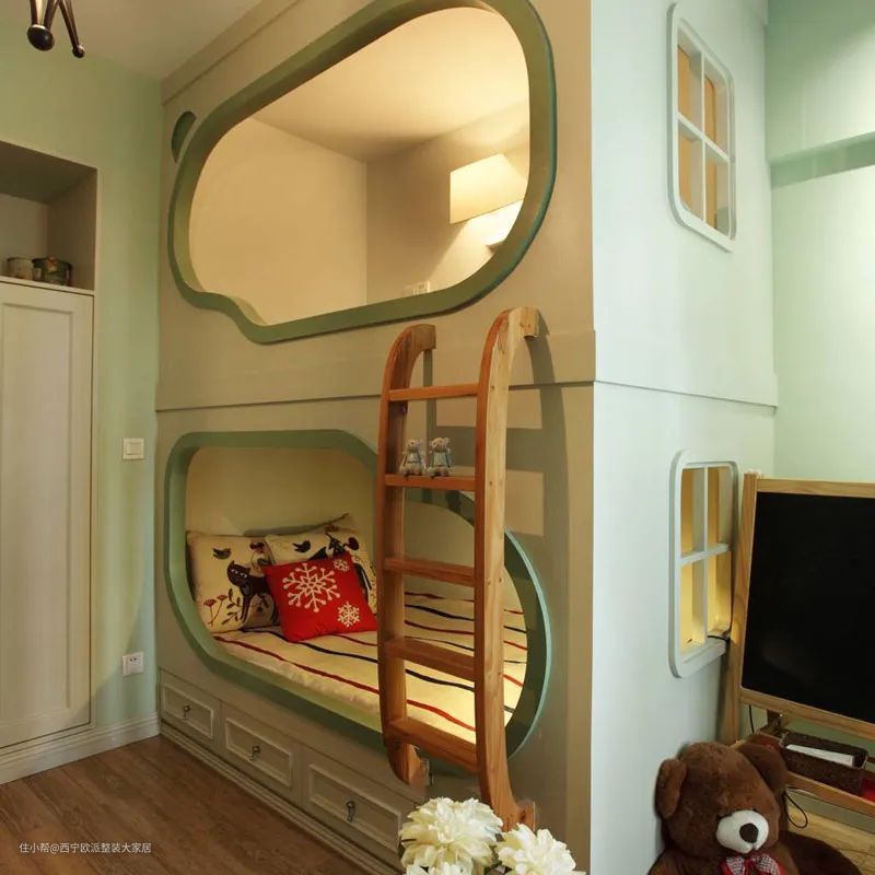 其实并不是4-5m的层高才适合搭阁楼,正常房间也可以搭一个“迷你”阁楼,可使空间更具趣味性,这样,孩子们就会抢着去二楼睡觉,而不是总感觉委屈了睡在上铺的宝贝。