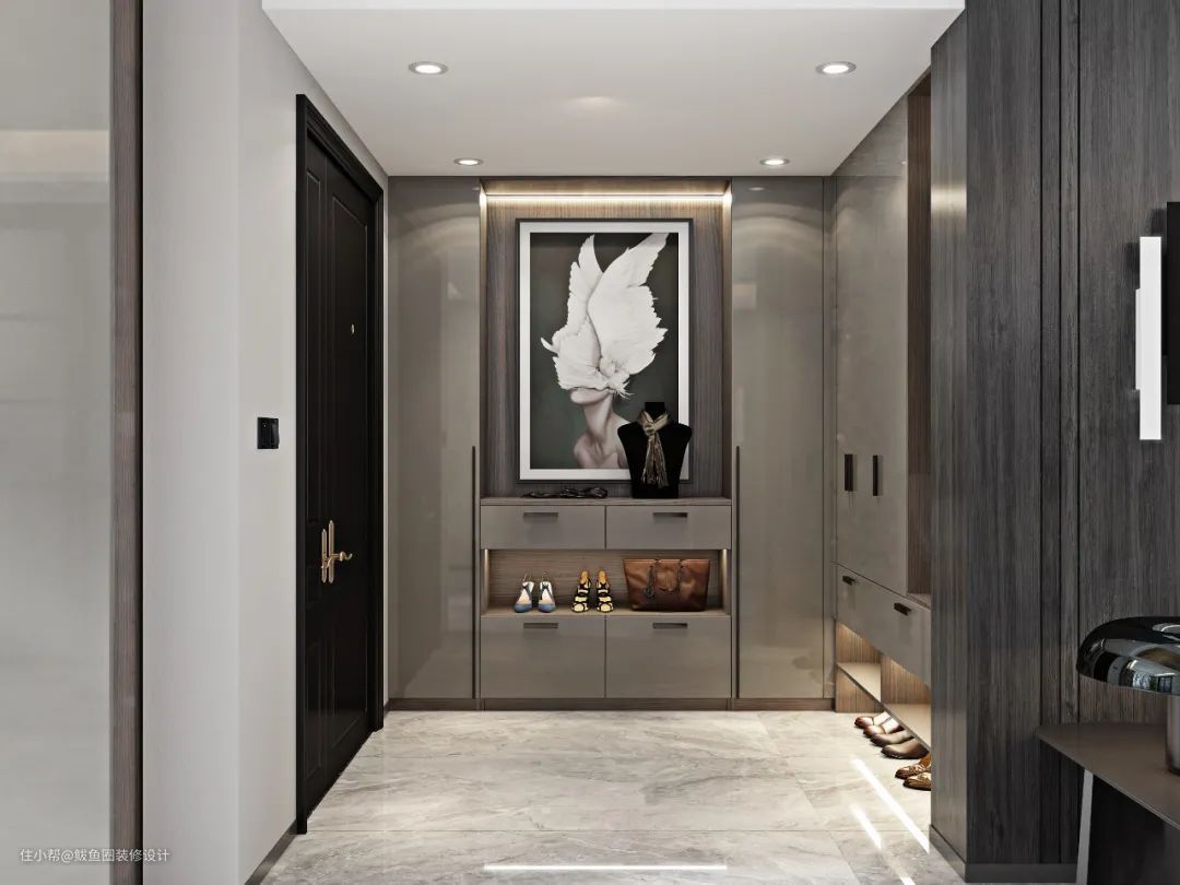 若是还想提升空间美感,可以借助置物台的空间,放上装饰品或挂画,入户见美的条件就有了。