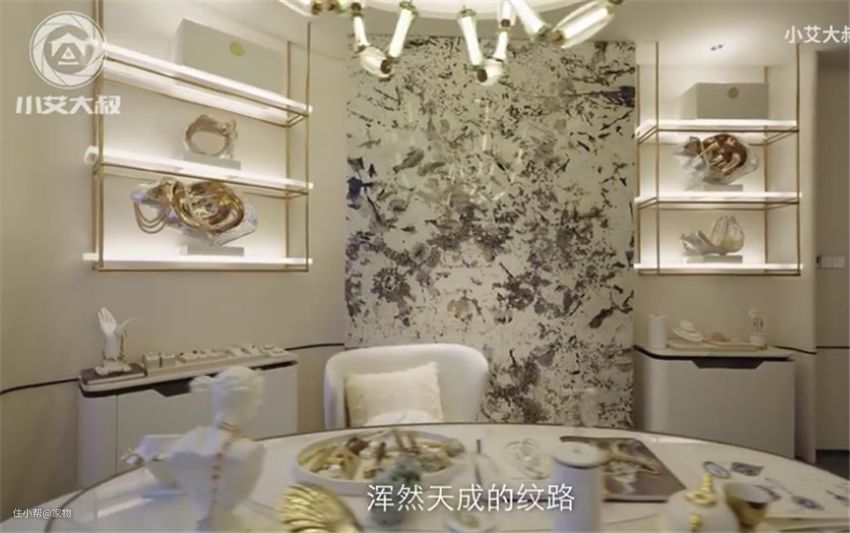 客厅右手边是个休闲室,别看面积不大,但珠光宝气。据说墙面使用的是巴西天山暮雪奢石背板,纹理自然,质感绝佳,反正很壕就对了。