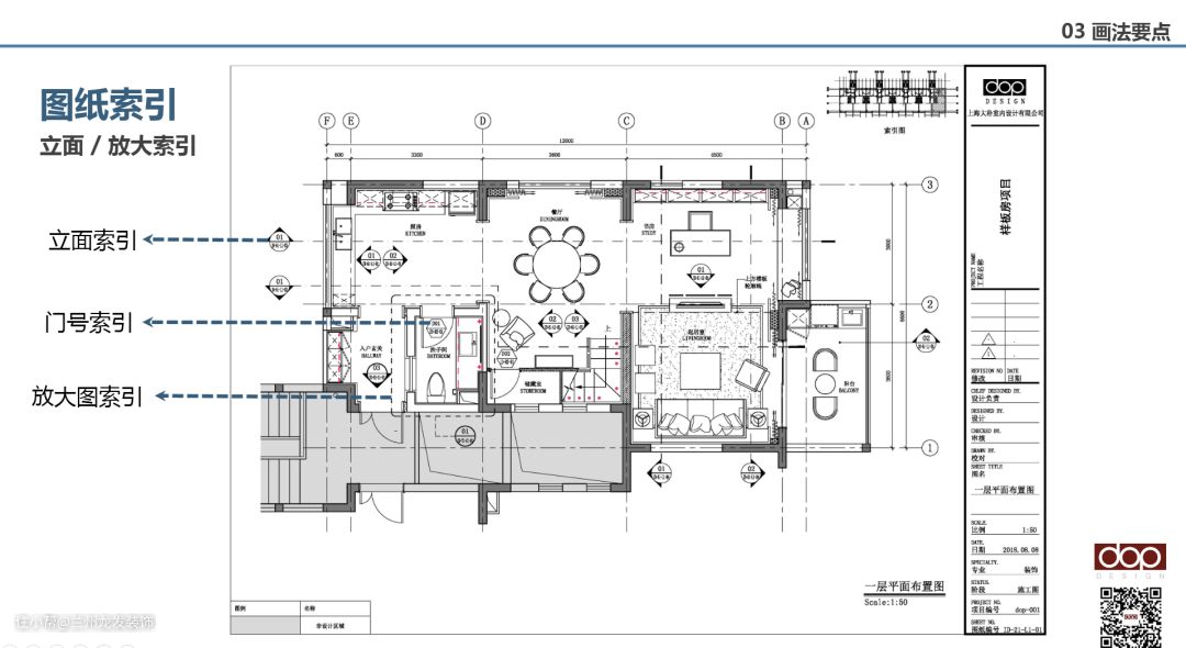 一套标准的施工图,需要具有相对完整的体系和内容,并且符合相关规范。完整的施工图包含平面图,立面图,节点图,门表,大样图及局部详图。而其中具体的内容包括目录、设计说明、材料表,图纸索引,图纸内容等。