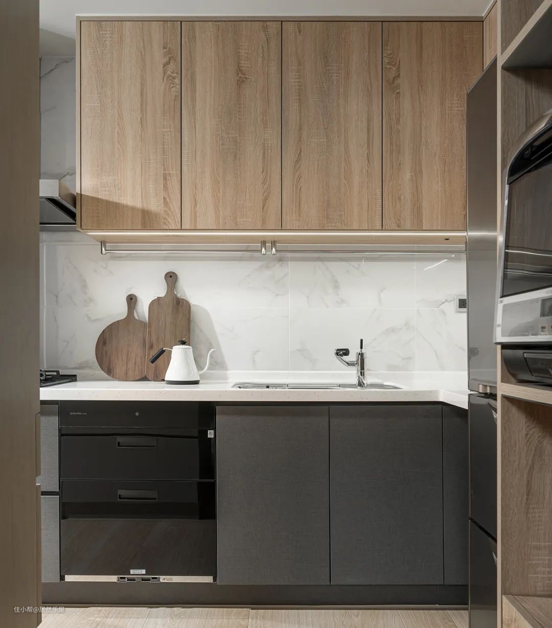 隐藏在明澈玻璃滑门后的厨房,依托屋主烹饪习惯和频率,打造L型厨房。以分段式手法带出空间层次,如浅褐棕吊柜、雪白银狐洗涤墙,以及人造石台面、柔灰织布底柜的紧密串接,围塑出沉稳内敛的氛围。并嵌入LED灯条,提高使用舒适感。另一侧电器柜,将厨房电器收纳规整保持整洁。