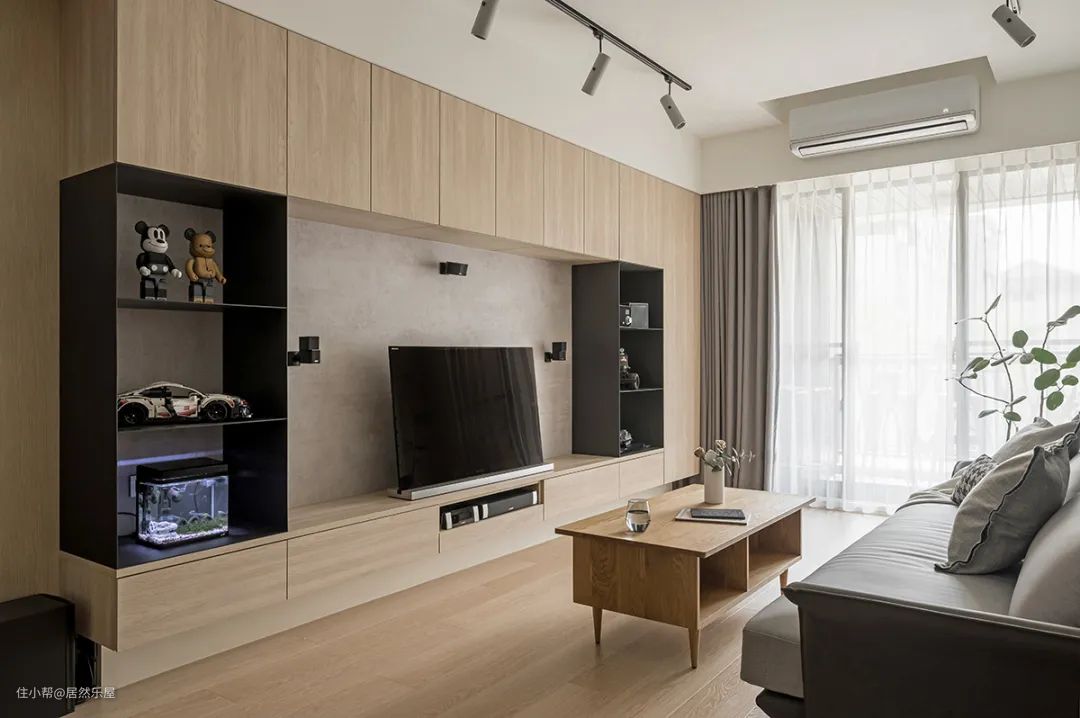 贴合大梁深度,以简洁有度的经纬线构筑悬空电视柜。温润木质和轻薄黑铁虚实交错,释放轻盈且有浓淡力道的即视感。为了效果更统一,卫浴采用隐形门设计,以轻暖木皮包裹,尽可能抚平突兀线框,延展出纯净阔绰的轴面。