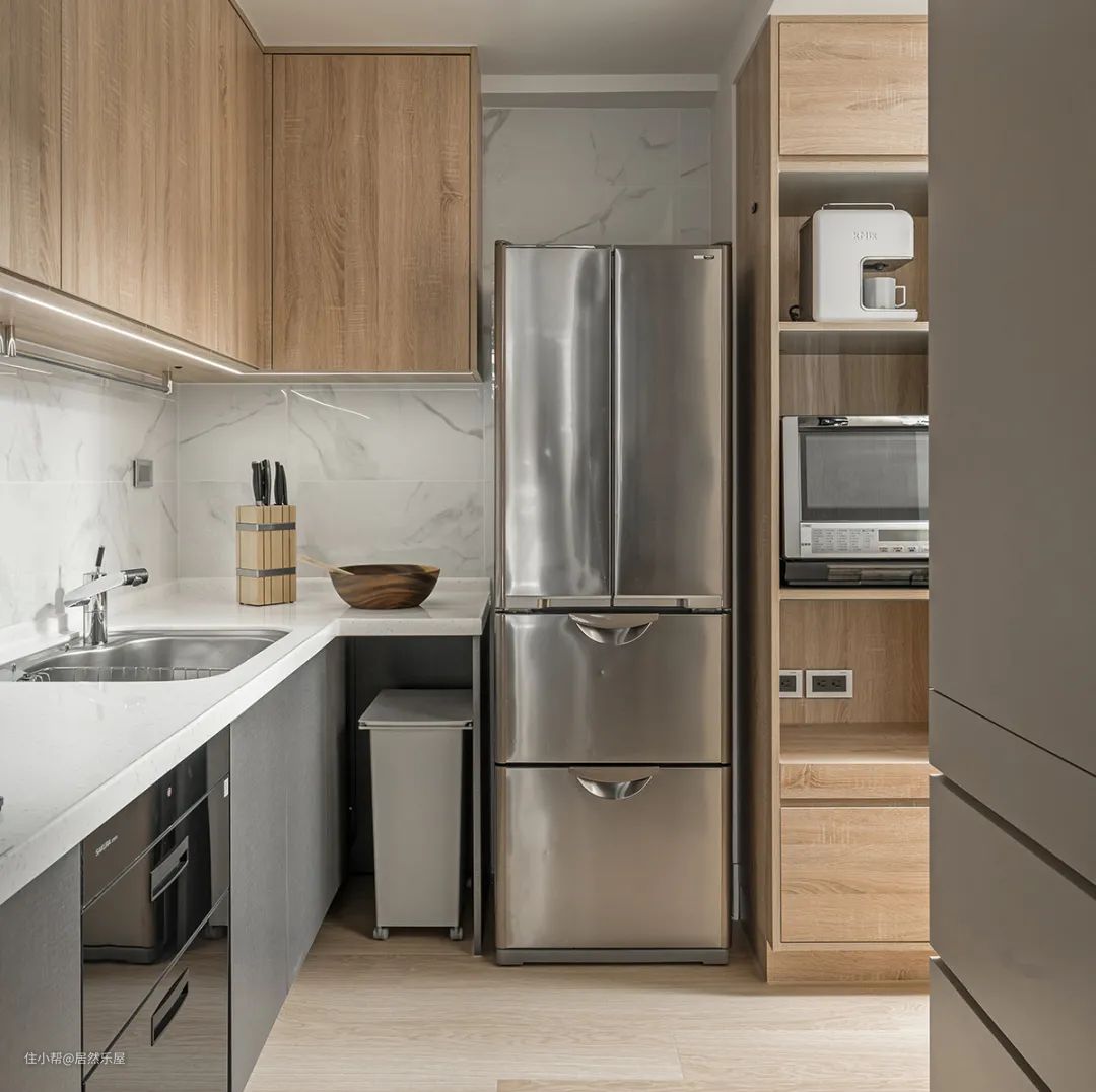 右侧角落空间,以搁板+抽屉腰柜,安然展放饮水机等小型厨电,勾勒出顺手流畅的使用动线。