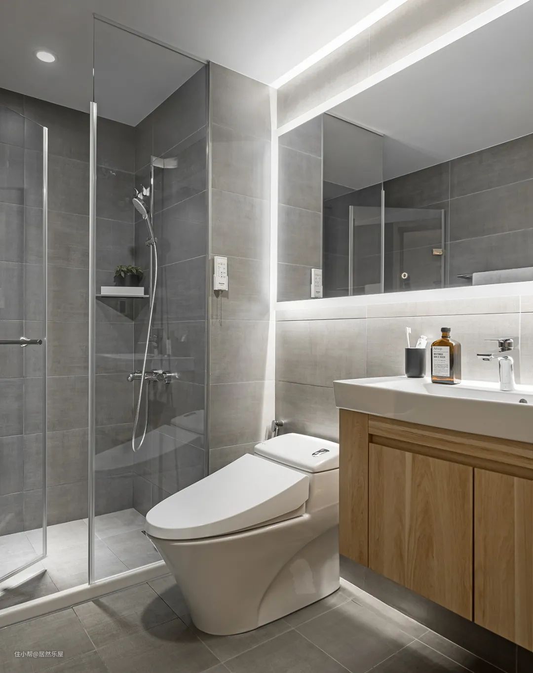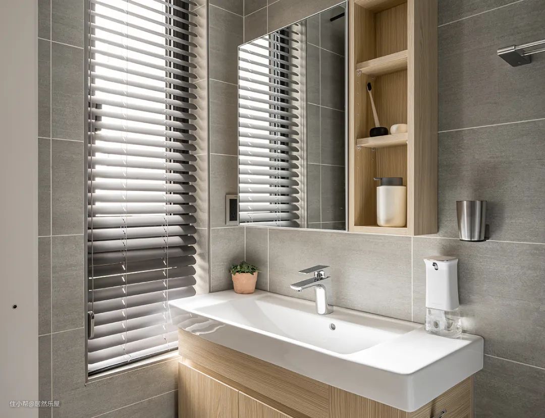 雅灰大板瓷砖奠定沉稳气质,以5cm宽轴墨黑百叶帘筛撒自然光,量身订制的镜柜,不只深度上避免了磕碰压抑,也提供了充足的收纳空间。