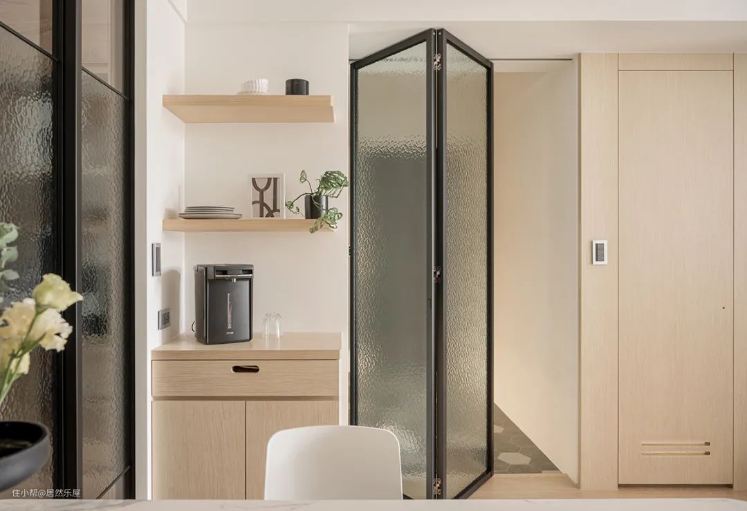 考虑到玄关与餐厅正对,因此以雾透水波纹砌构灵动折叠门,薄雾纹理虚化尴尬视线,开合之间穿引光线,打造一面灵活的边界。
