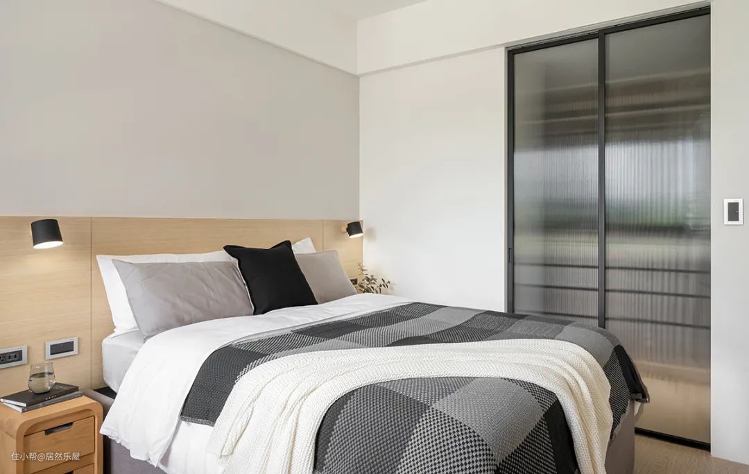 背景墙覆盖一层奶油雾灰棕,并横向推开木质饰面板,带出空间层次。两侧预埋插座,方便3C产品的使用。细条玻璃滑门的雾透特性,正好消隐步入式衣帽间内衣服的痕迹,使画面回归简洁纯净。