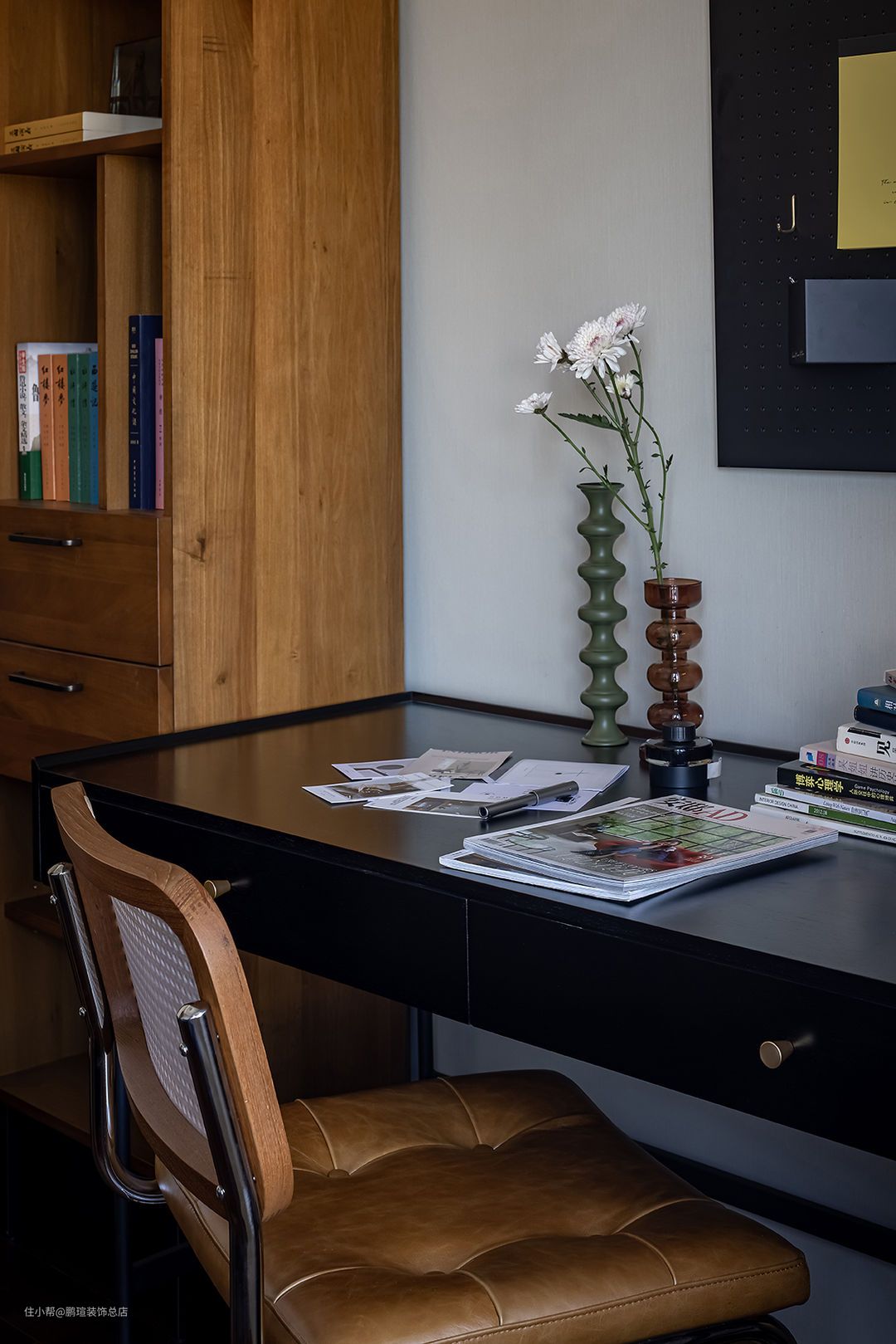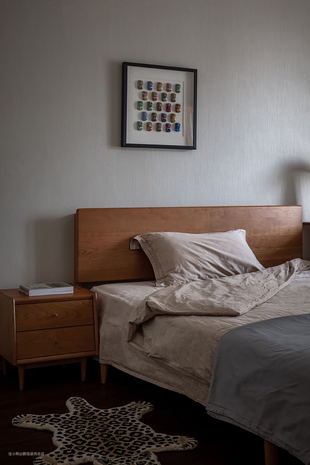 深色美国黄杨木床头柜与杨木斗柜,黑色铁椅腿,细金属拉手小细节元素与款式的呼应。