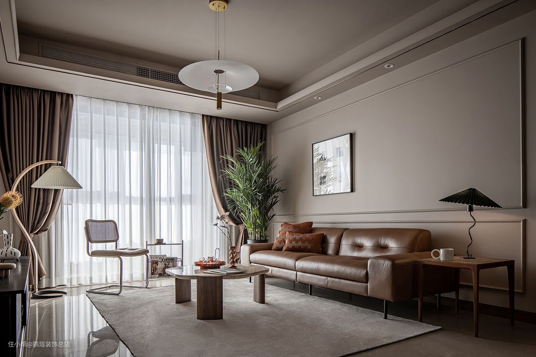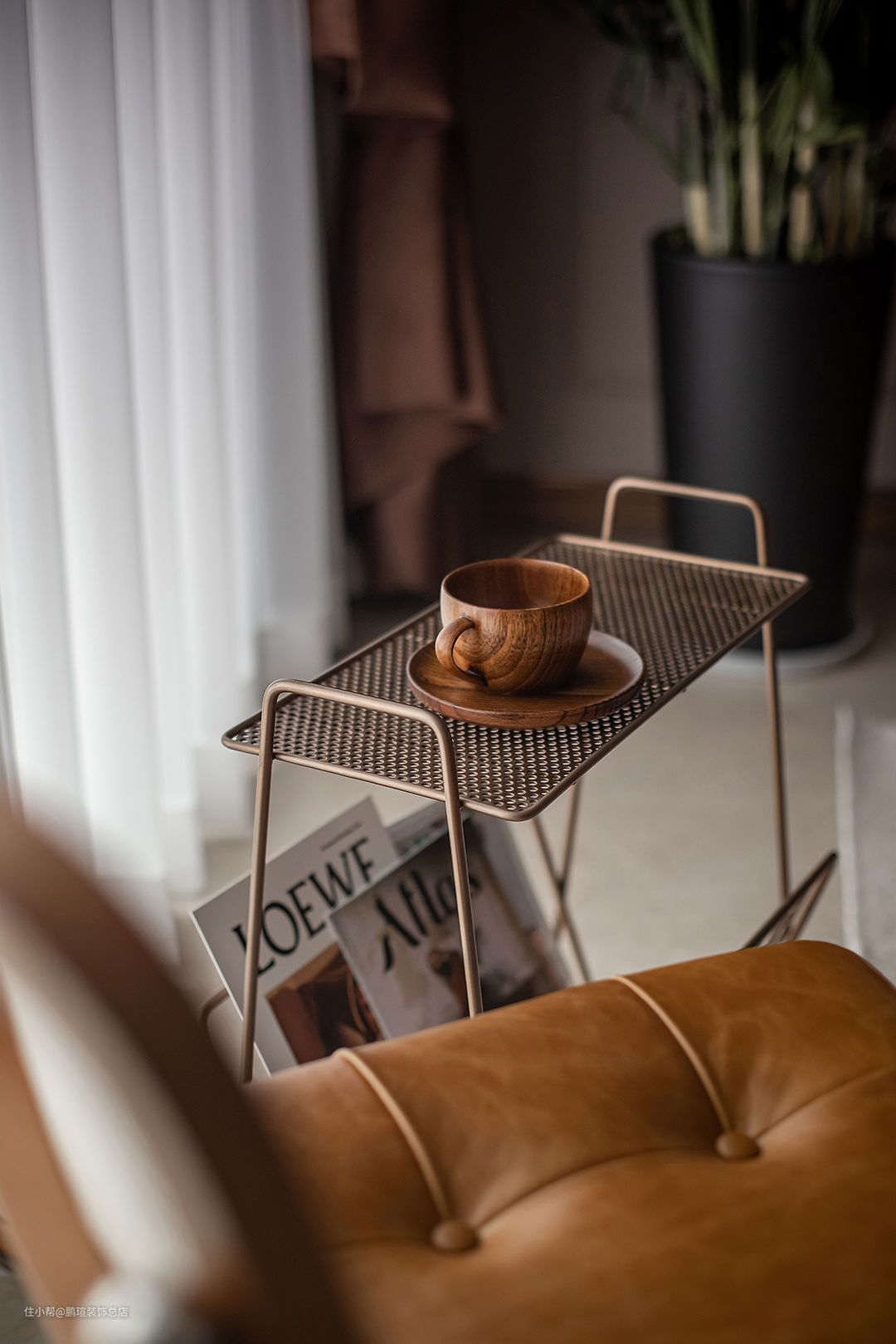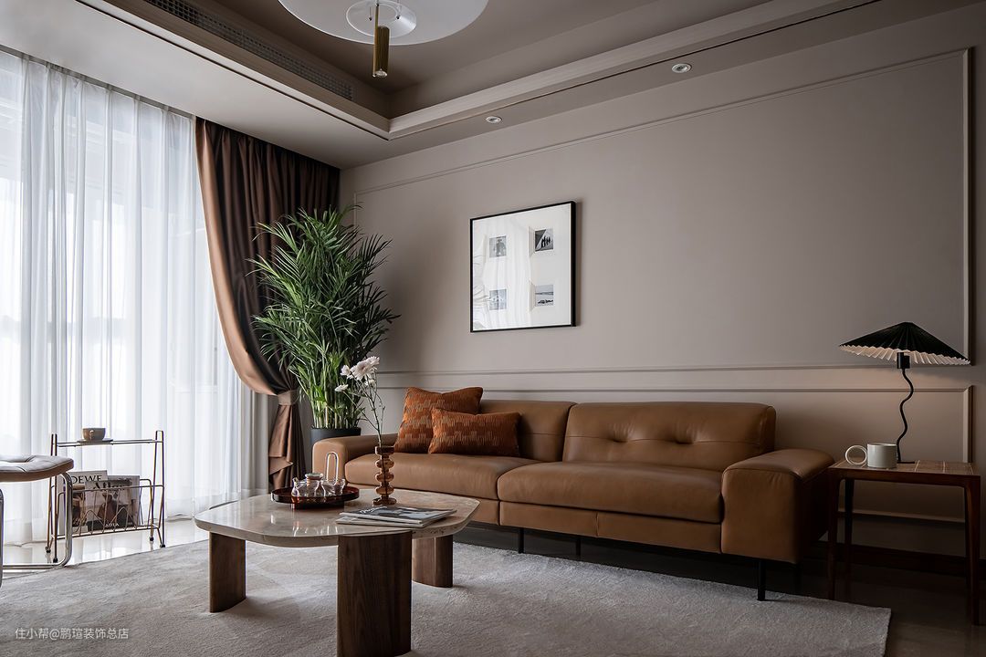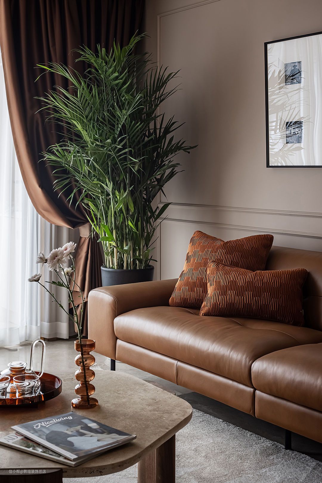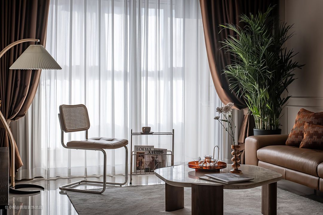 摩登复古质感的CAMPAIGN三人沙发,宽扶手设计可充当临时的置物平台,沙发两侧分别是MUNA柚木花砖边几,与筑物片刻金属杂志架。