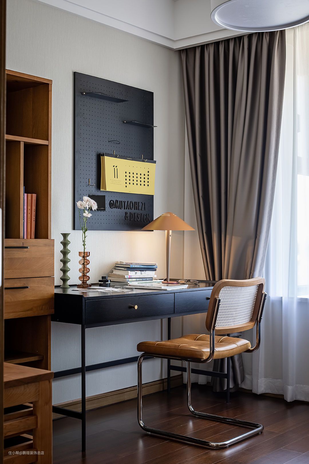 男主人书房。Dulton实铁奶白色五斗抽屉柜满足作为律师男主人的卷宗收纳,满足功能需求并兼具美观