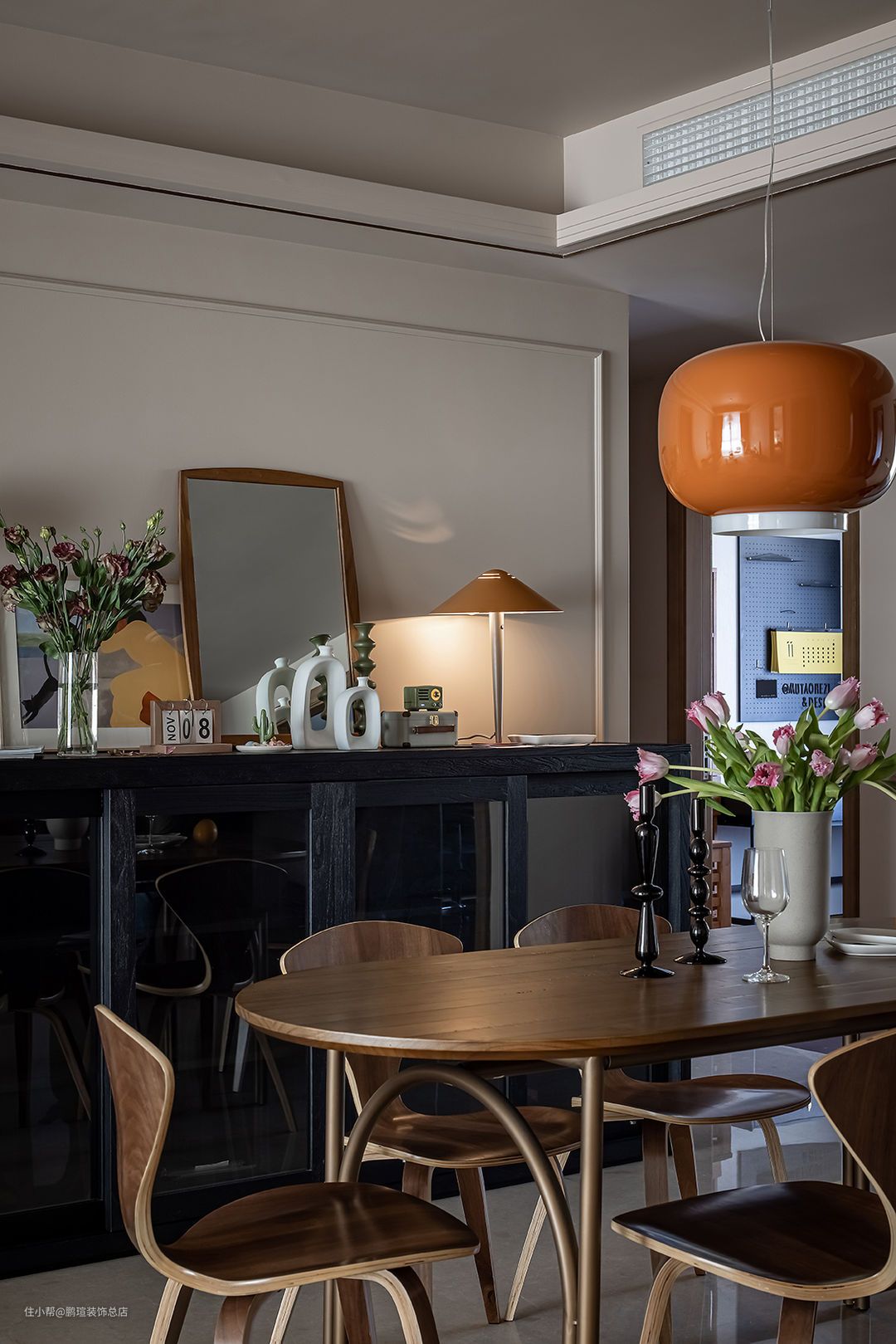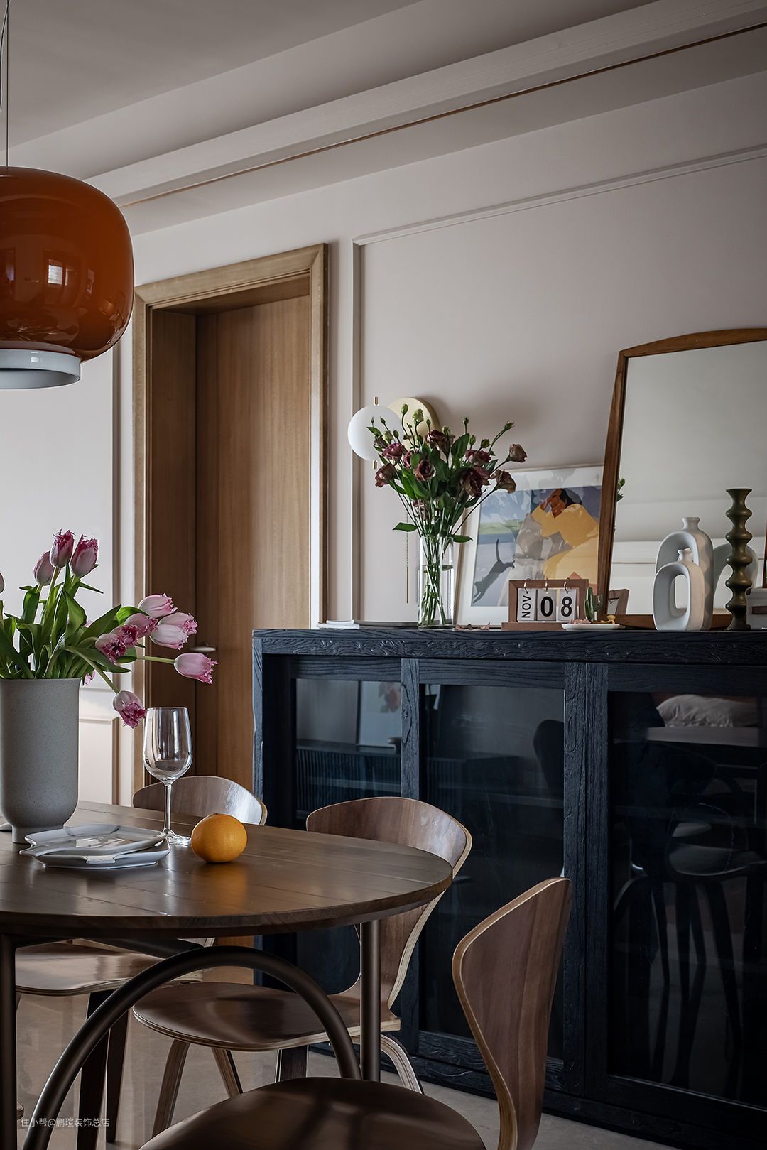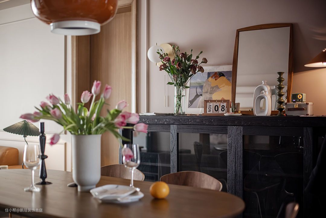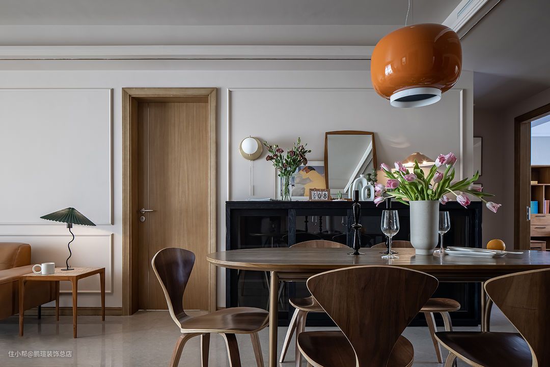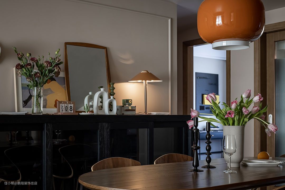 Foscarini Chouchin设计的橙色蘑菇小吊灯点亮餐厅氛围。在其一侧搭配Livin/利物因高容量榫卯结构木制黑色餐边柜,玻璃柜门满足了女主人防止落灰的需求,相对克制装饰的造型,让人专注于感受材料本身的气韵。