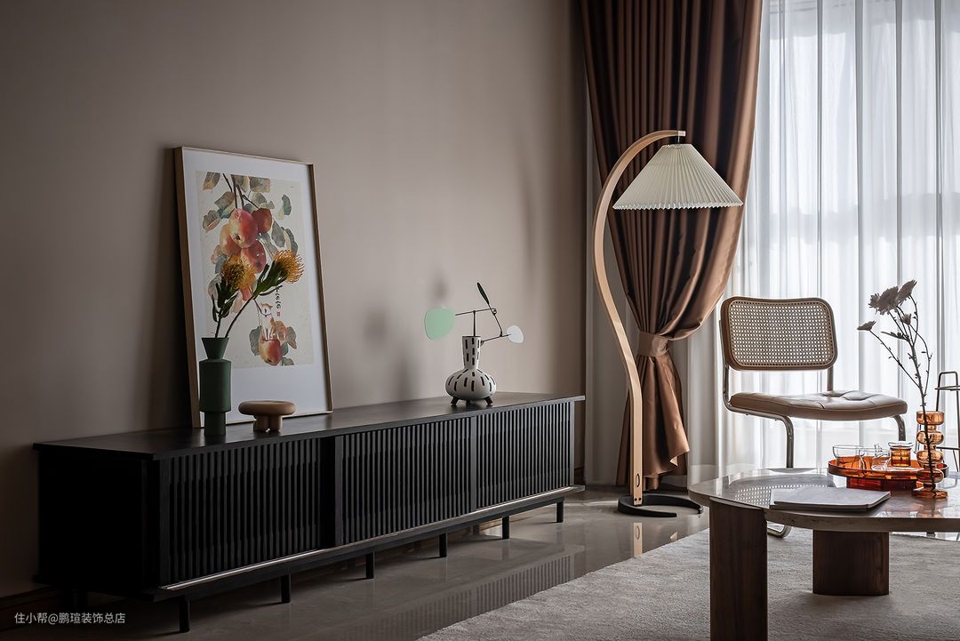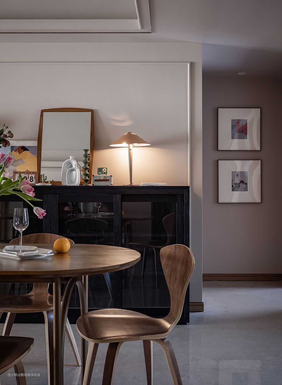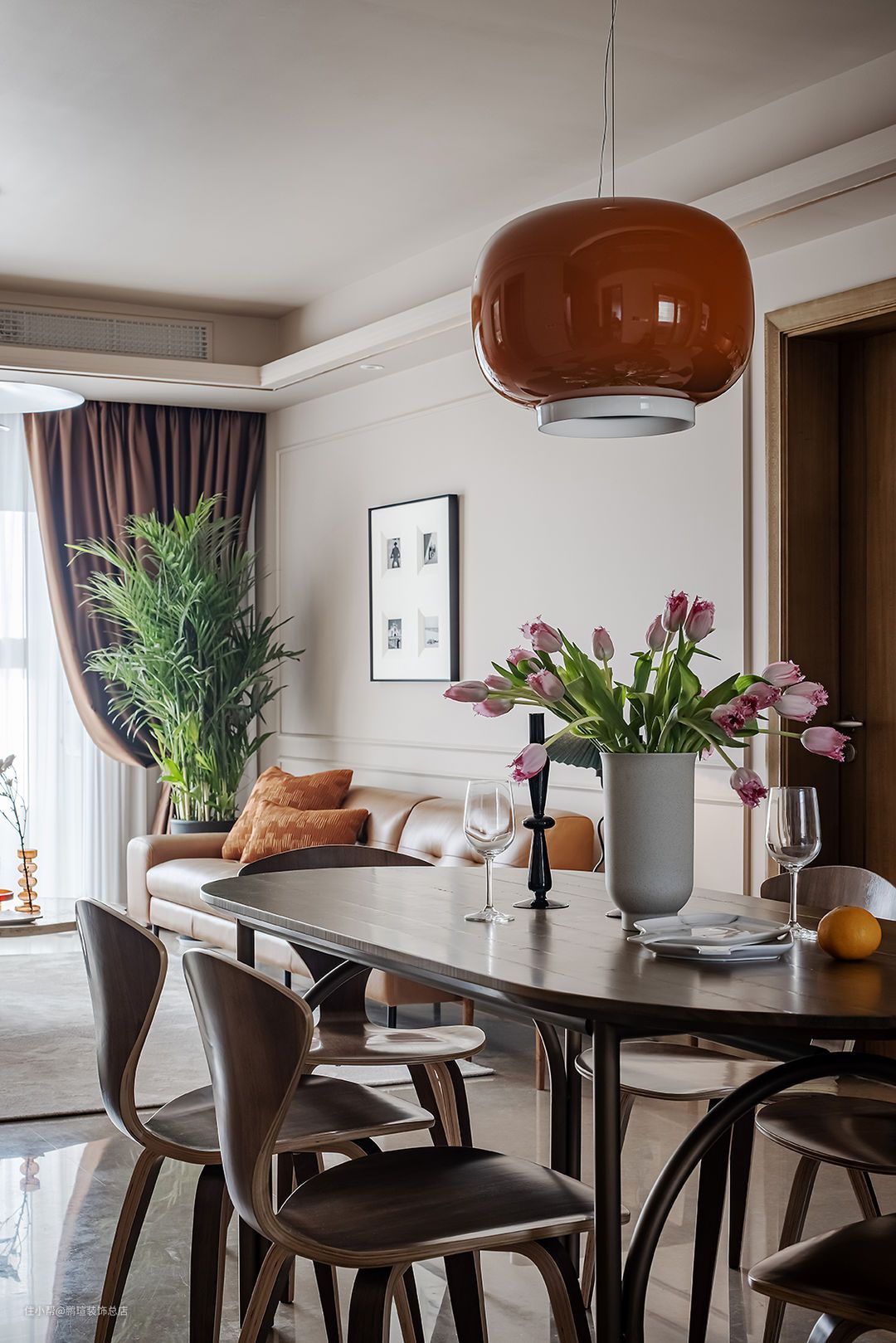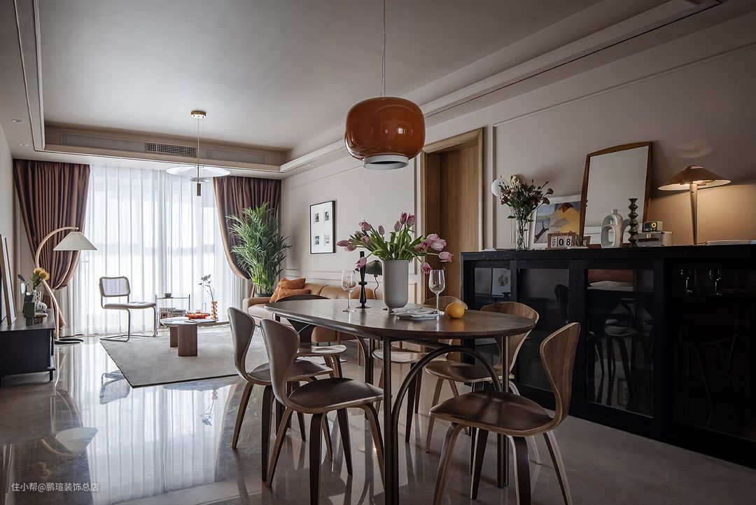 Foscarini Chouchin设计的橙色蘑菇小吊灯点亮餐厅氛围。在其一侧搭配Livin/利物因高容量榫卯结构木制黑色餐边柜,玻璃柜门满足了女主人防止落灰的需求,相对克制装饰的造型,让人专注于感受材料本身的气韵。