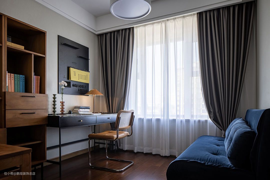 女主人书房同时兼具客房、小孩手工间、储藏间等诸多功能。深蓝色绒布可折叠沙发为客人提供服务。Mumo的A2收纳架以及Erika书柜为小孩书籍,画作提供收纳空间。