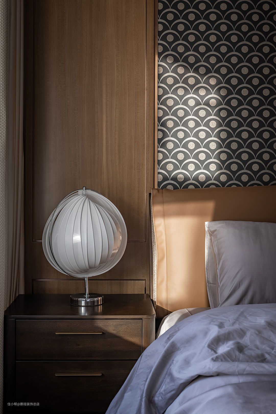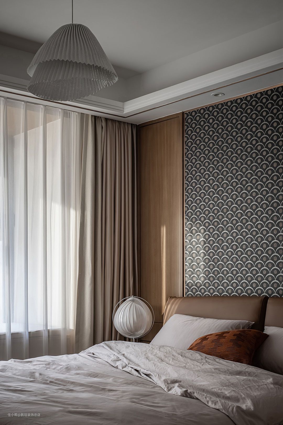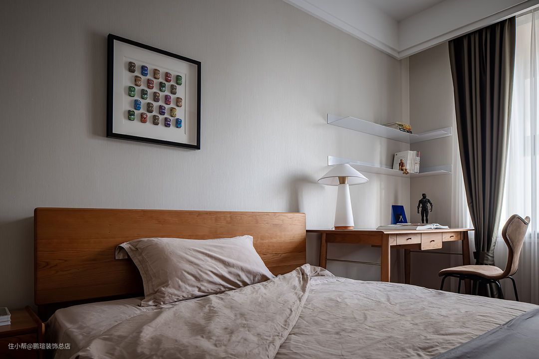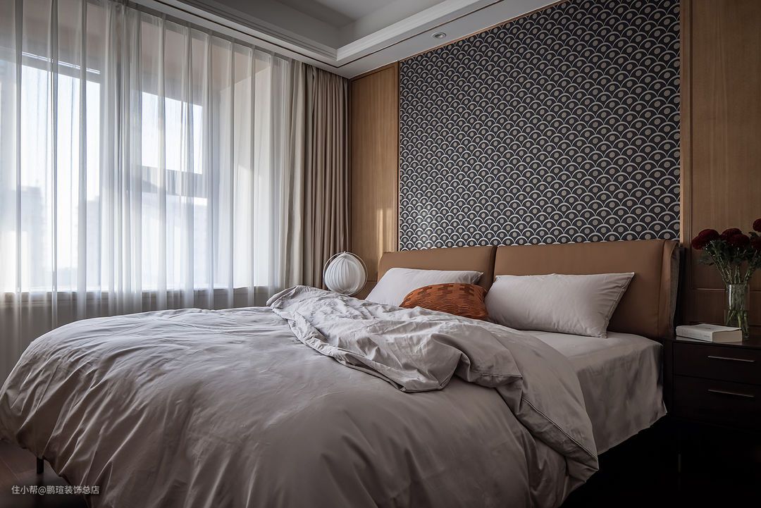 主卧沿用咖色系搭配灰色系床品,与保留的原有床头背景协调。局部改造背景软包,搭配英国Harlequinh LEONIDA玻璃珠颗粒黑色壁纸尽显摩登风味。