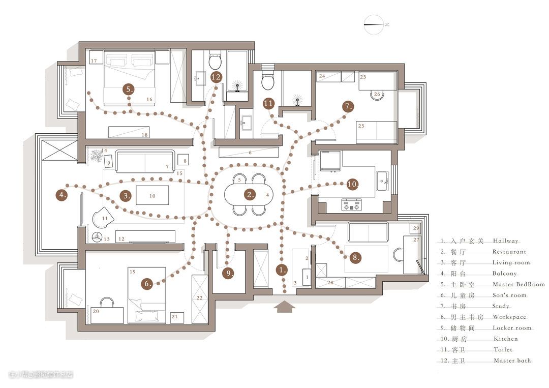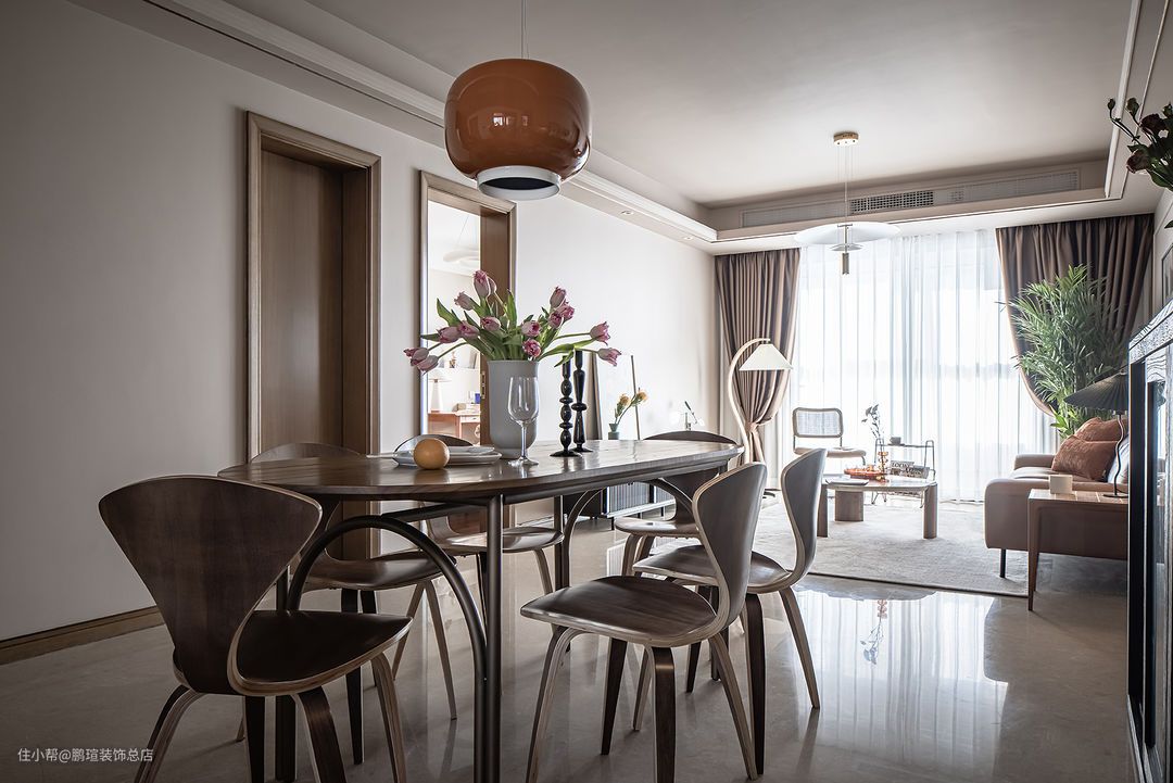 综合考量圆形餐桌与方形餐桌的优缺点与空间适用性,选择了这款实木手工做旧桌面搭配拱形门造型金属桌腿托圆桌。餐椅选用Norman Cherner设计的胶合板椅,用胶合板凹成的椅子,是现代主义最具有特色的作品群之一。