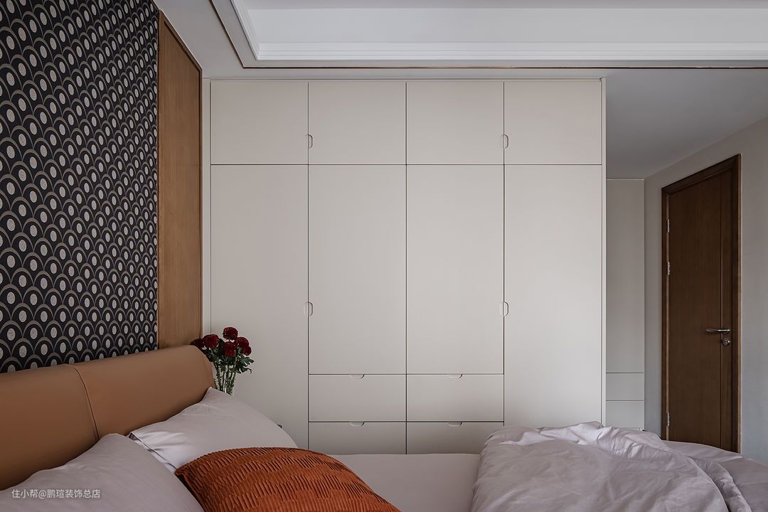 开发商精装交付的主卧室没有衣橱,后期选择全屋定制衣柜,满足日常储物需求。