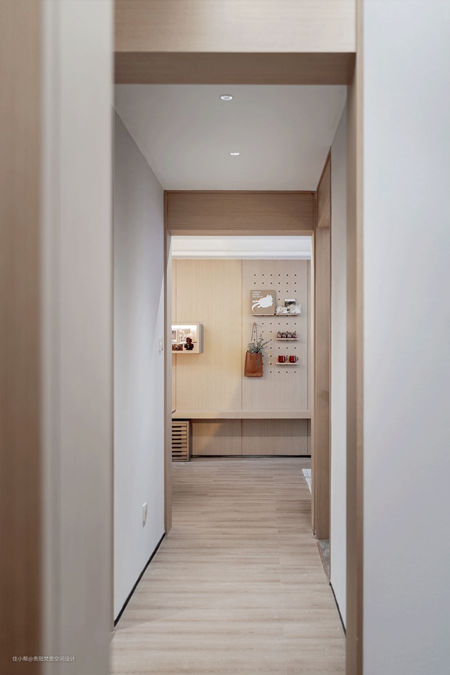 墙上的洞洞板、玻璃瓶里的小木头、挂包里的干花,装点出纯粹质朴的生活。
