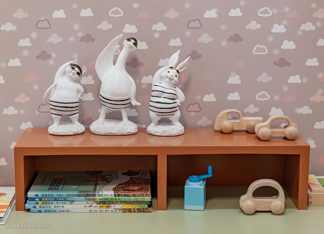 儿童房给人以温柔宁静的舒适感受,各种动物元素的摆件饰物给原本静谧的空间增添了些许灵动与设计感。