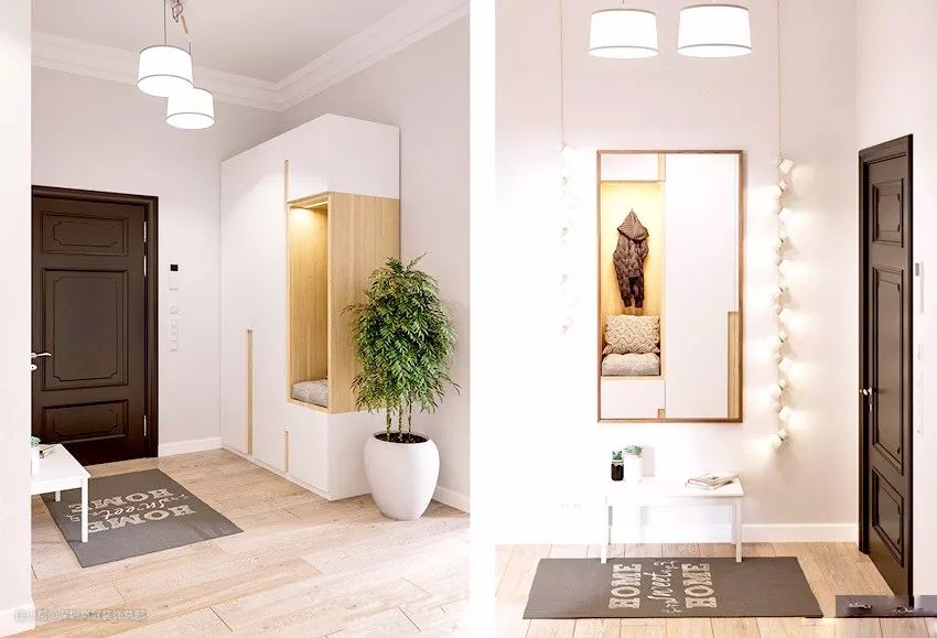 那么家里没有玄关的户型,要怎么补救?这个要分两种情况,如果进门空间比较紧凑,那就想方法放个鞋柜,实现收纳功能,如果进门空间充足,就可以设置一个隔断,实现玄关区的独立。