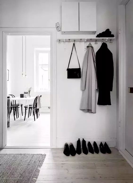 如果家里常住的人数不多的话,更建议只装隔板架,其它的比如板凳或挂钩就不要布置了,直接留白,这样既可以保持空间的通透,整个空间的视觉也会有扩充的效果。