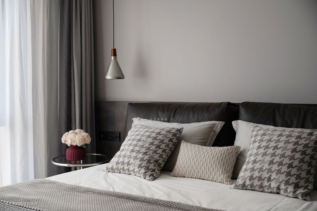 床头两侧采用金属吊灯,背面墙板打底,色调上统一。