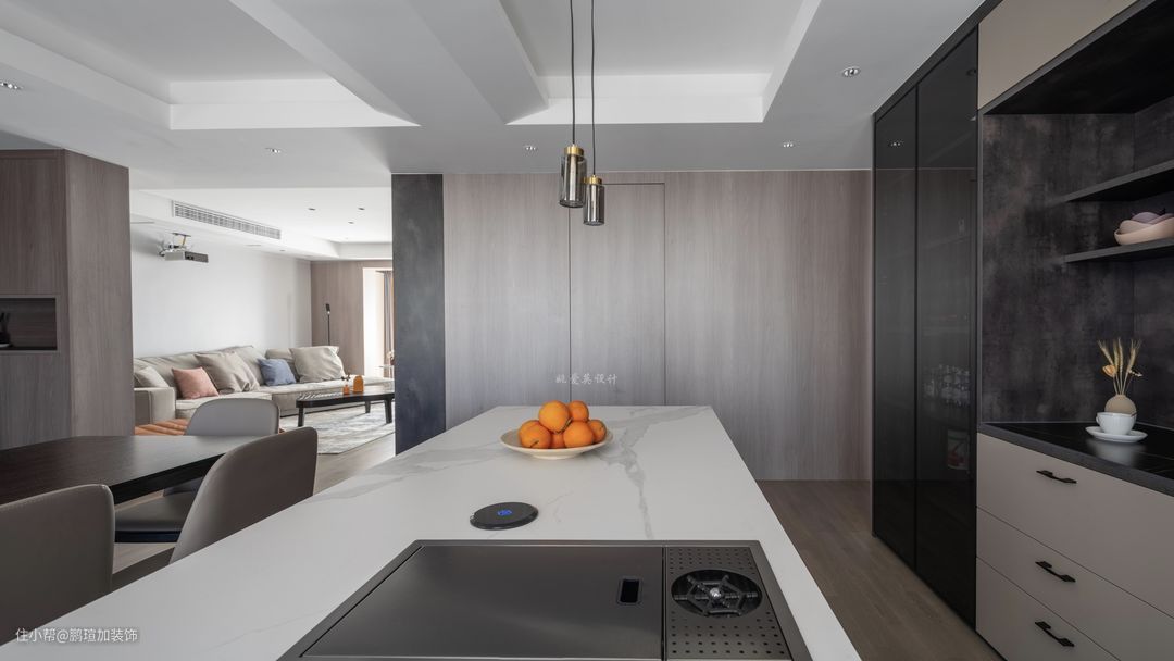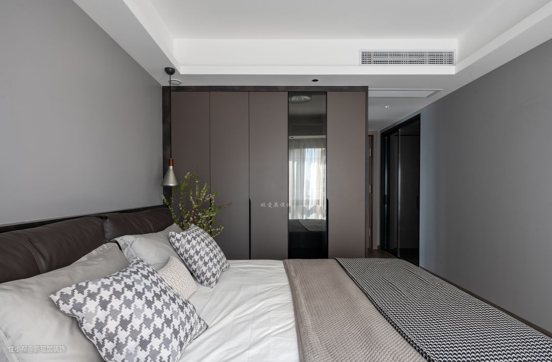 为了增加视觉的冲击力,主卧也和次卧一样采用隐形门设计,将整个墙体从餐厅一直延伸到了主卧。备餐柜还内嵌了一台多开门网络冰箱,门上带有液晶屏,可以随时点播各种美食的制作视频,当然对于全职太太来说,有时边制作美食,边追剧,也是一种不错的享受。