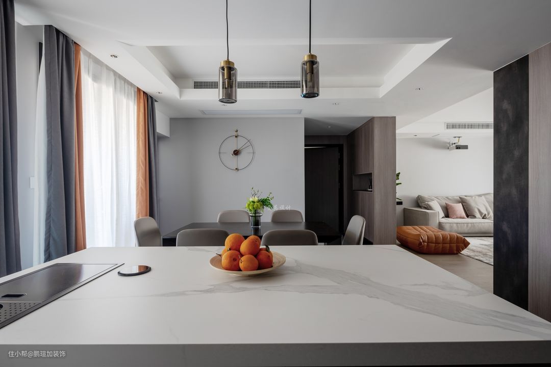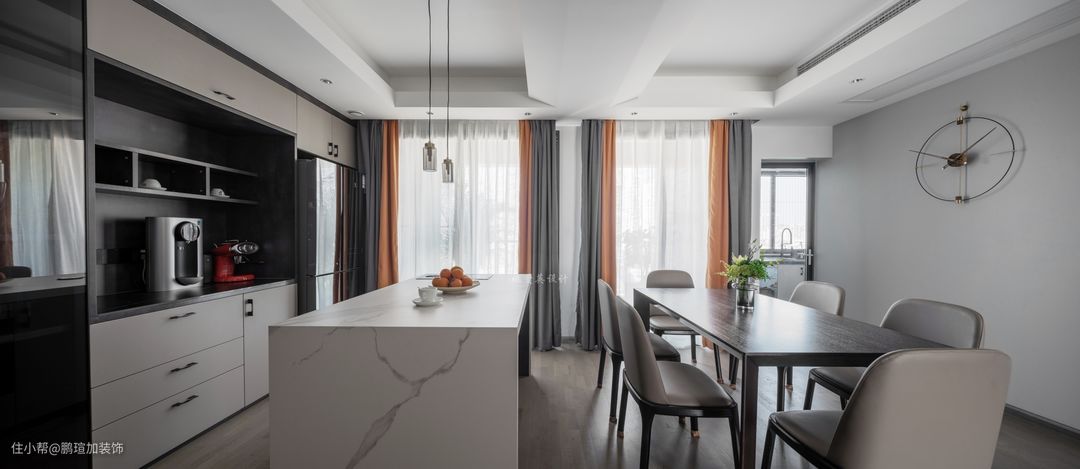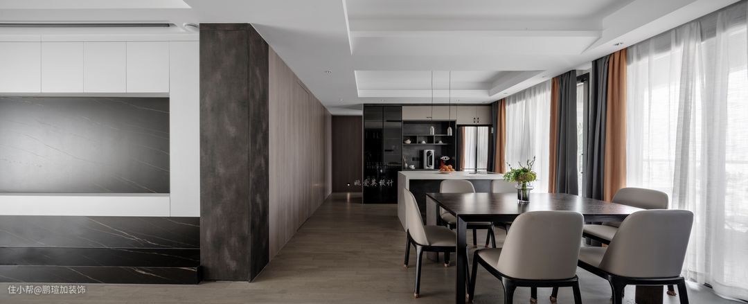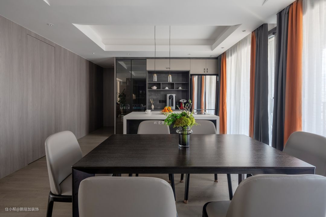 餐厅被划分为三个区域,从左到右依次是备餐柜、中岛台和餐桌。满足业主不同的生活需求,在餐厅顶部中间有一根非常大的横梁,从六边形获得灵感,将中间横梁转化成三边切角造型,化解了横梁的尴尬。两扇落地推拉玻璃门采用双层双色拼接电动窗帘装饰。