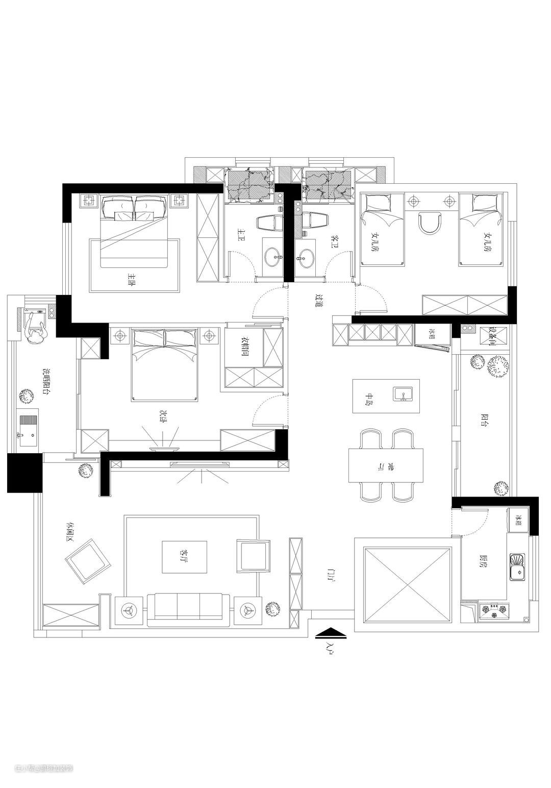 考虑到常住人口只有四人,厨房又比较小,所以采用中西厨设计,既解决了厨房的问题,又增加了西厨的生活需求。客厅的阳台包进客厅,扩大了休闲空间,将洗晒阳台设置在次卧方向。由于将原来的一个房间做成西厨,所以整个餐厅扩大了一倍,同时还由于一个超大阳台,给喜欢种花的男主人新增一片小花园。