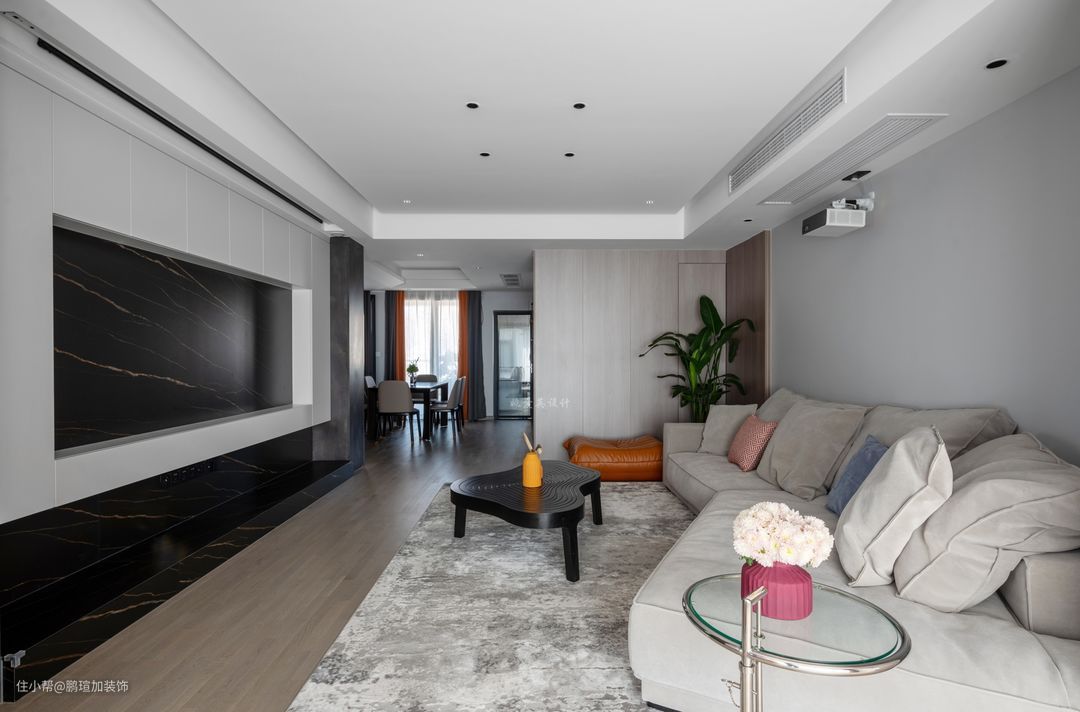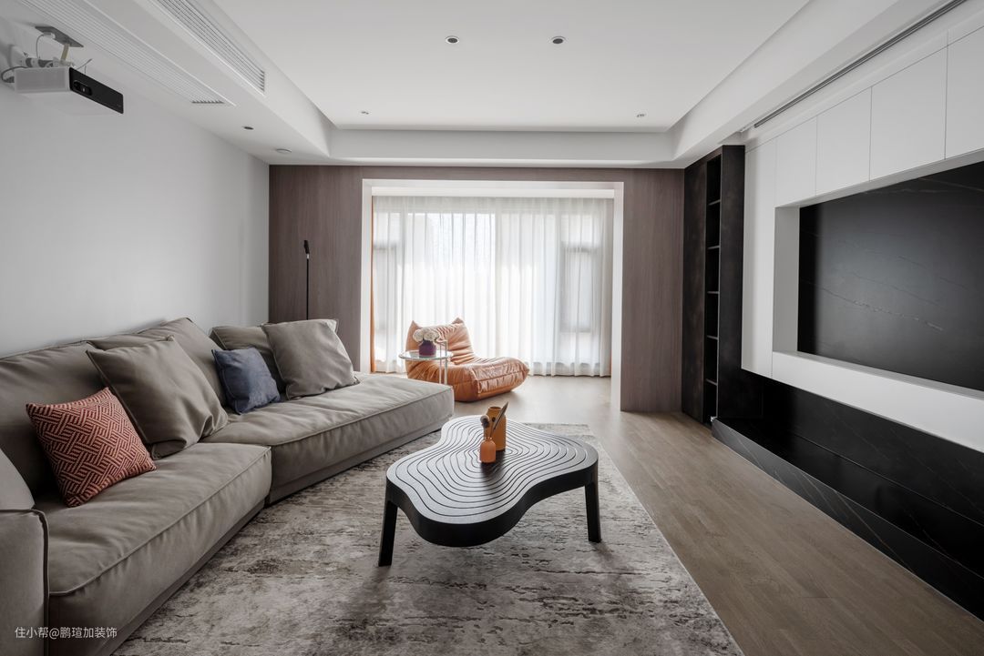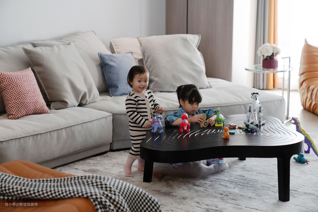 考虑到孩子尚小,客厅茶几采用弧角异形,避免磕碰。沙发下面铺上细绒地毯,这里就是孩子们的乐园。客厅采用无主灯设计,让层高显得更高,更显大平层风范。由于业主定购的电视还没到货,电视背景墙预留的机位目前只能先空着。
