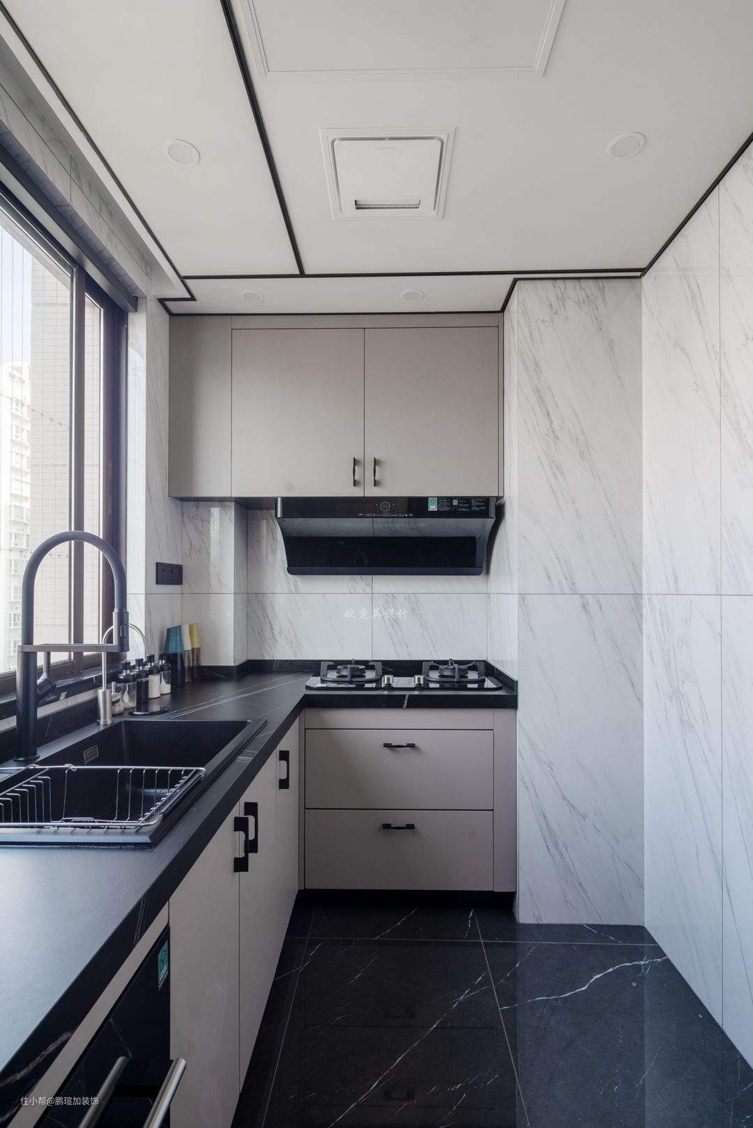 厨房的空间较小,采用整体橱柜定制而成,台面采用黑色岩板,耐脏又不怕变色。墙面采用白色瓷砖,地面为黑色地砖。由于前期楼上出现漏水,所以吊顶采用集成式,为了和厨房风格协调,特别选择了这款有金属线条的集成板。在厨房的另一端,是一个双门冰箱,专门存放平时买回来的菜。