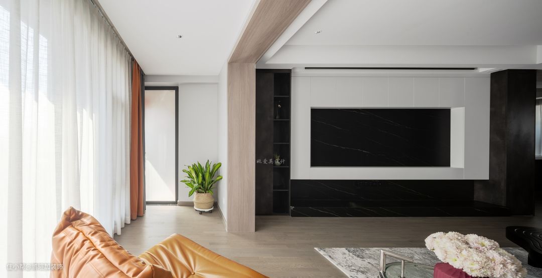 休闲阳台的一端,开了一个玻璃门,这样去洗晒阳台就不用通过次卧,而影响家人休息了,真正做到动静的分离。客厅两侧的剪力墙用墙板铺贴,让整体更协调。