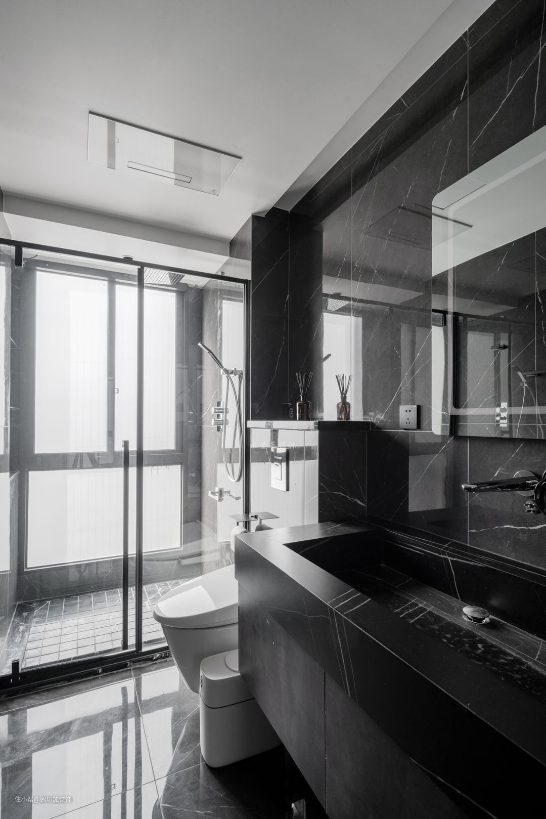卫生间采用黑色主色调的干湿分离,淋浴区地面采用整块大理石拉槽设计,可很好的防滑。马桶采用墙排,避免了卫生的死角。