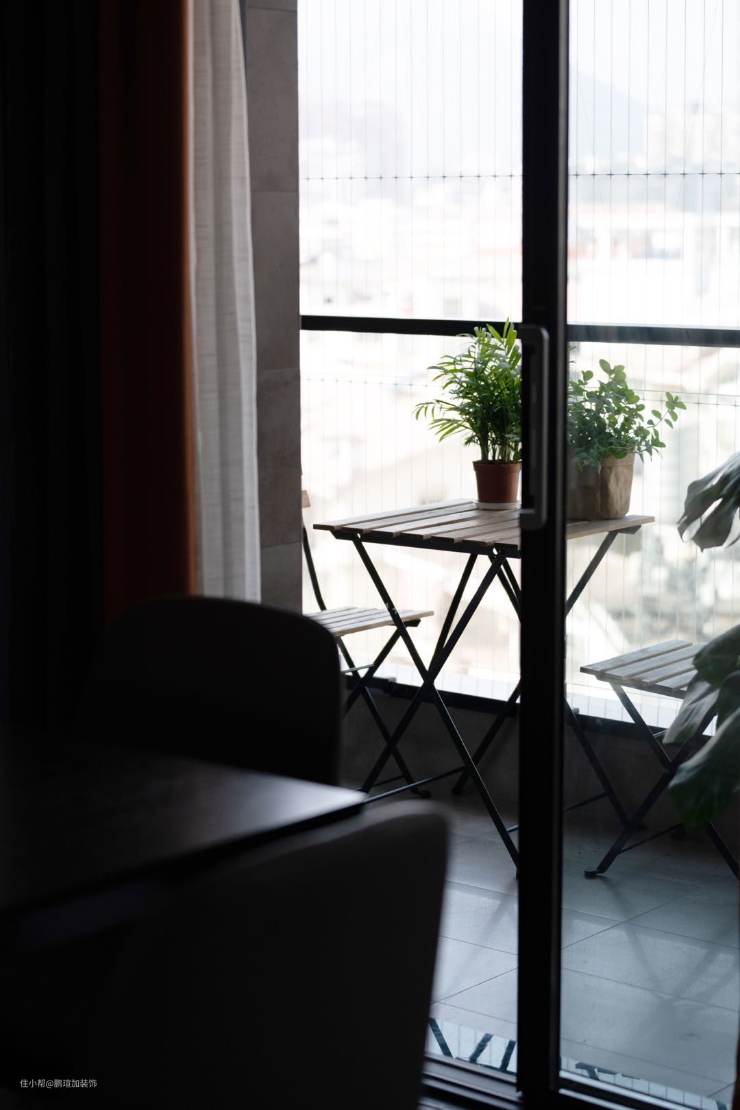 餐厅阳台推拉门外是男主人的花园阳台,一套户外桌椅,在家也能感受大自然里的花草。